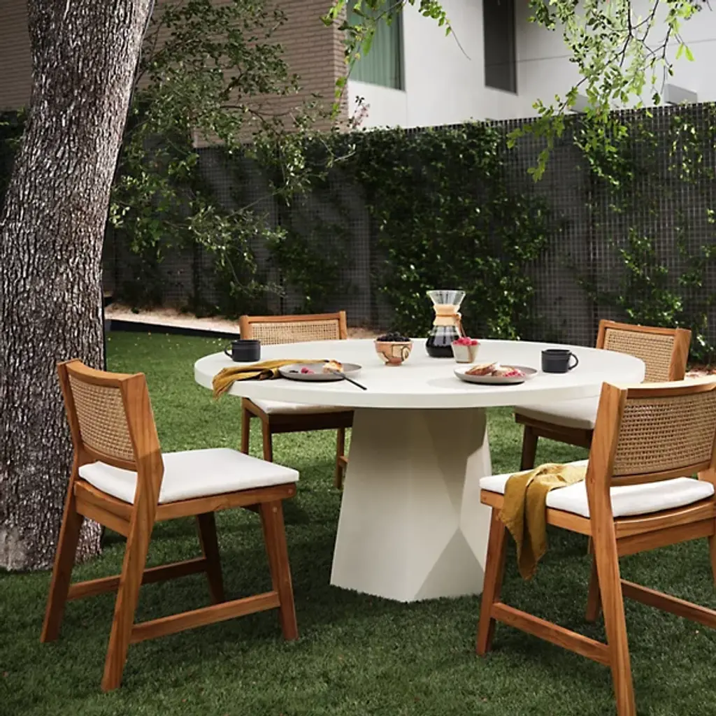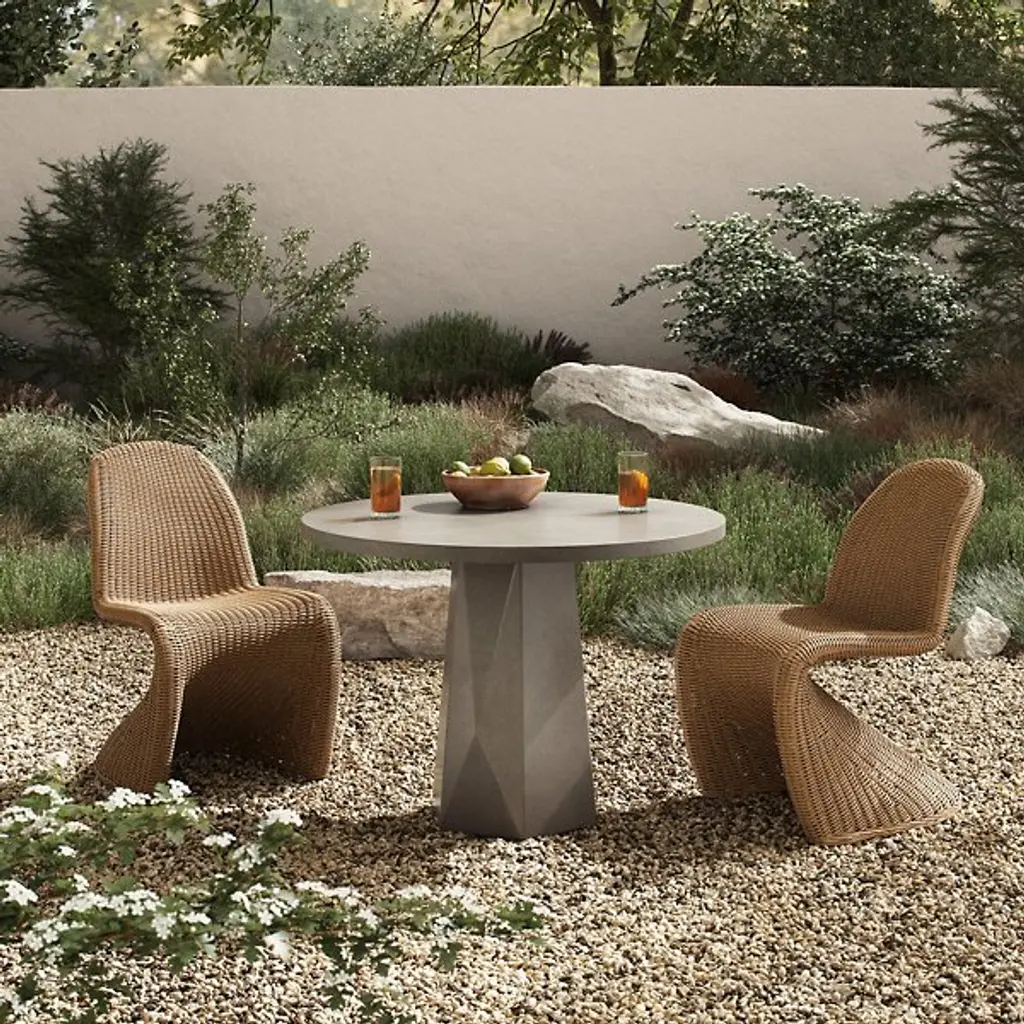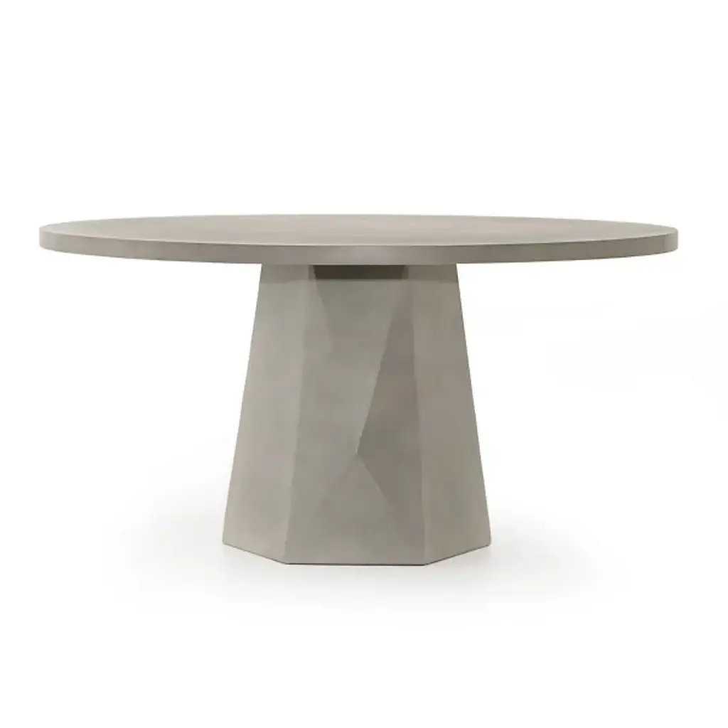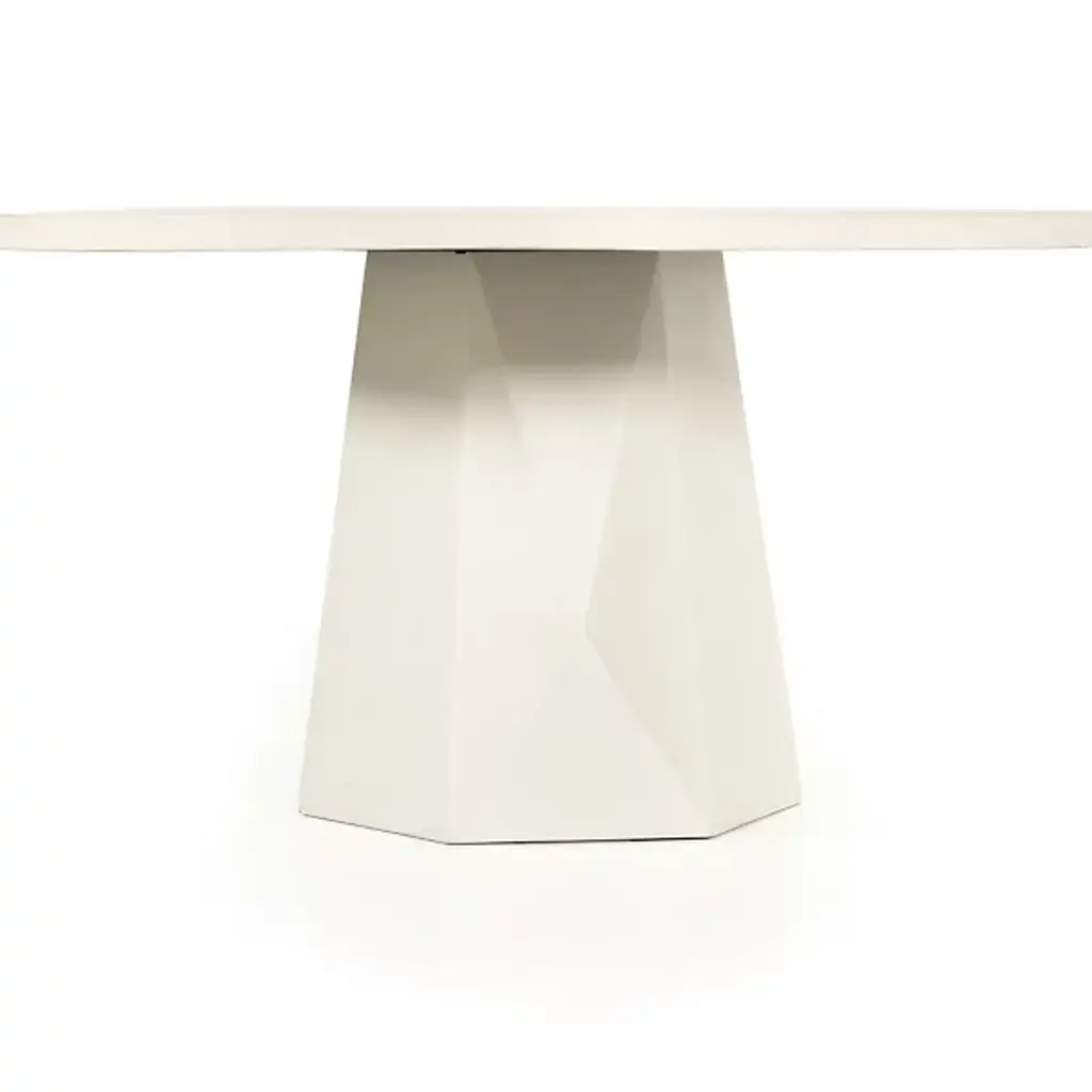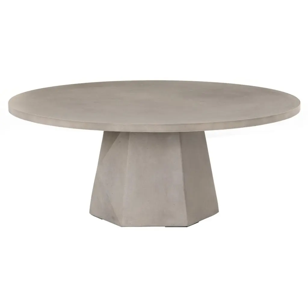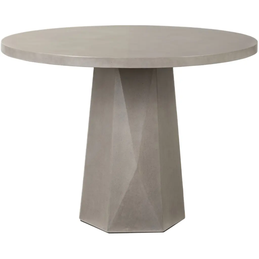 The Bowman Outdoor Dining Table by Four Hands boasts a striking faceted base that delivers visual impact from every angle. Its spacious, rounded top offers plenty of room to welcome guests, whether used indoors or outdoors. This versatile and stylish table is ideal for any entertaining space. To preserve its beauty and longevity, be sure to cover or store the table indoors during inclement weather and when not in use.