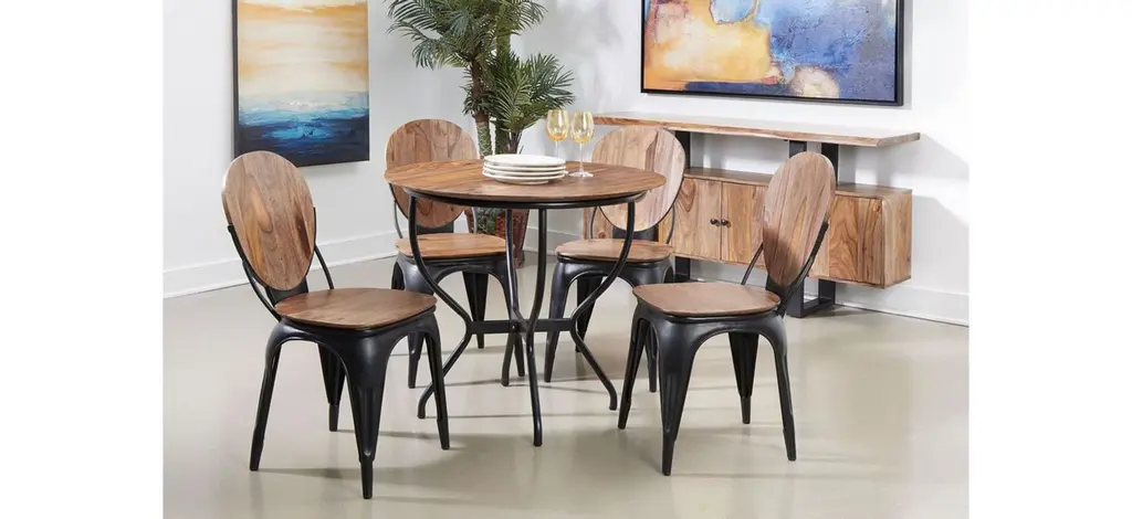 The perfect size for that kitchen nook or for out in your sunroom, our circular Bradford II Dining Table features a rich acacia wood atop a curved dark metal base. Add a few of the matching dining chairs to create an ideal spot for your morning coffee or for your family game night.