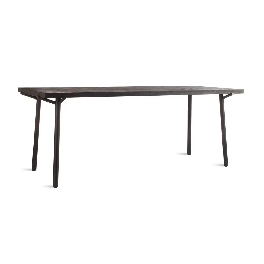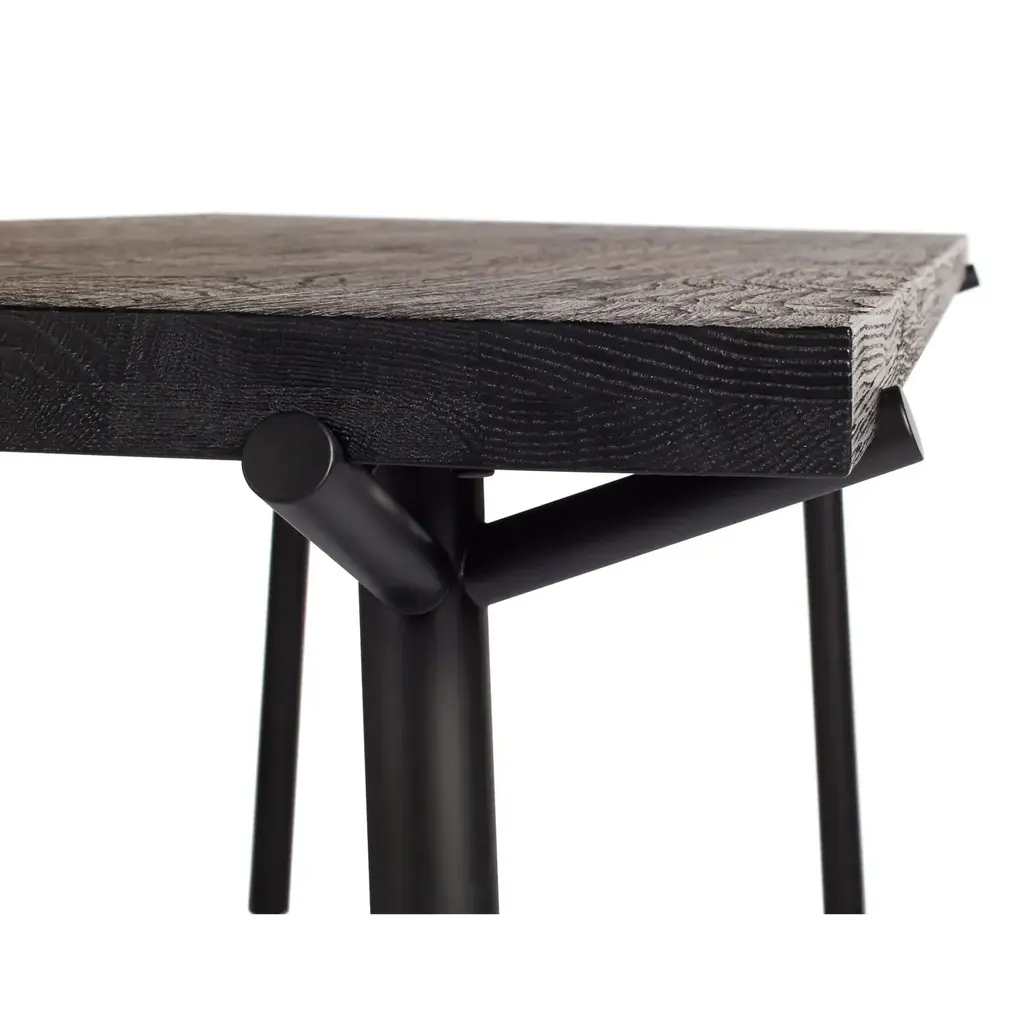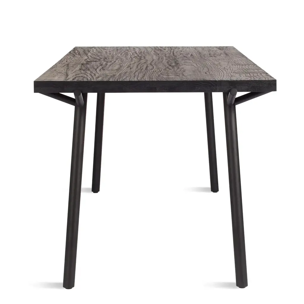 Sculptural powder-coated steel legs handsomely prop up solid wire-brushed oak.