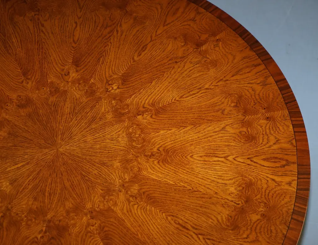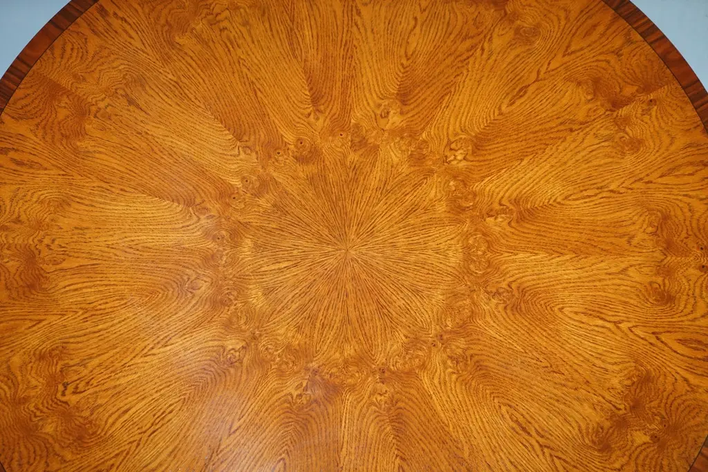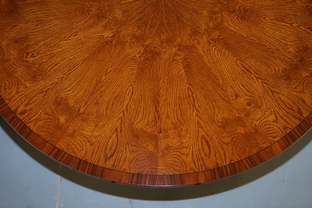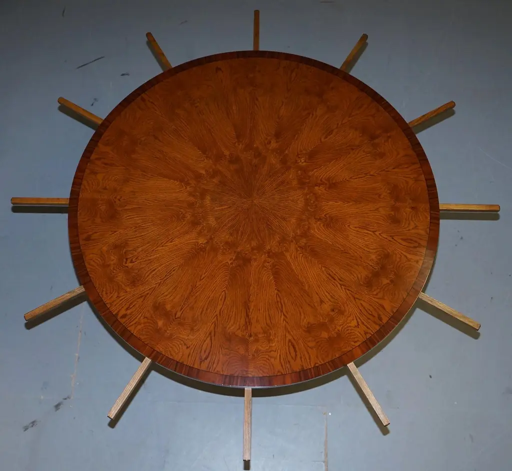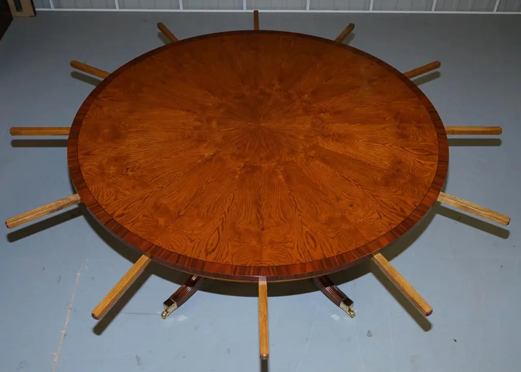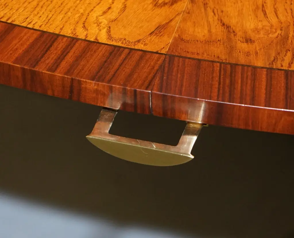 We are delighted to this stunning brand new cluster oak Jupe round extending dining tableThis table is brand new, I have seven left in the cluster oak and two in flamed mahogany. At the moment all the tables are in the white, what that means is they haven’t been stained and lacquer French polished yet, the table pictured was finished and has already been sold. The finish you see is the natural finish meaning how they would all be finished however they can be custom polished to a color of your choosing should you wish for a lighter or darker shadeThe lead time on the finishing is 2-4 weeks, all the tables come with solid brass handmade in England feet with castors, as you can see there are rather elegant looking solid brass clips between the extension leaf joints, these are in the shape of a square letter C and they hold the leaves in situsThis set of tables are all cluster oak with Santos X banding. All the extension leaves are numbered on the underside and the number of the leaf corresponds to the position number on the base of the table, to fit the extensions leaves you pullout / pull-out the extension gliders, seat the correctly numbered leaf in place and then repeat until all six leaves are in place, you then fit the solid brass clips and away you goDimensions:Height 76.5cmWidth 150.5cm extending to 213.5cmUnder tabletop height 74.25cmPlease note all measurements are taken at the widest pointThis item is available for collection from our Wimbledon warehousesCondition:Please view the very detailed pictures as they form part of the description around conditionPlease note vintage period and original items such as leather seating will always have natural patina in the form of cracking creasing and wear, we recommend regular waxing to ensure no moisture is lost, also hand dyed leather is not recommended to sit in direct sunlight for prolonged periods of time as it will dry out and fade.