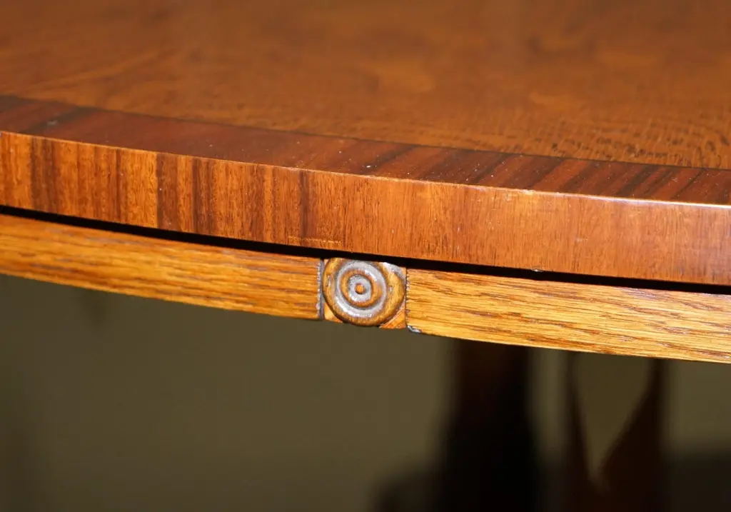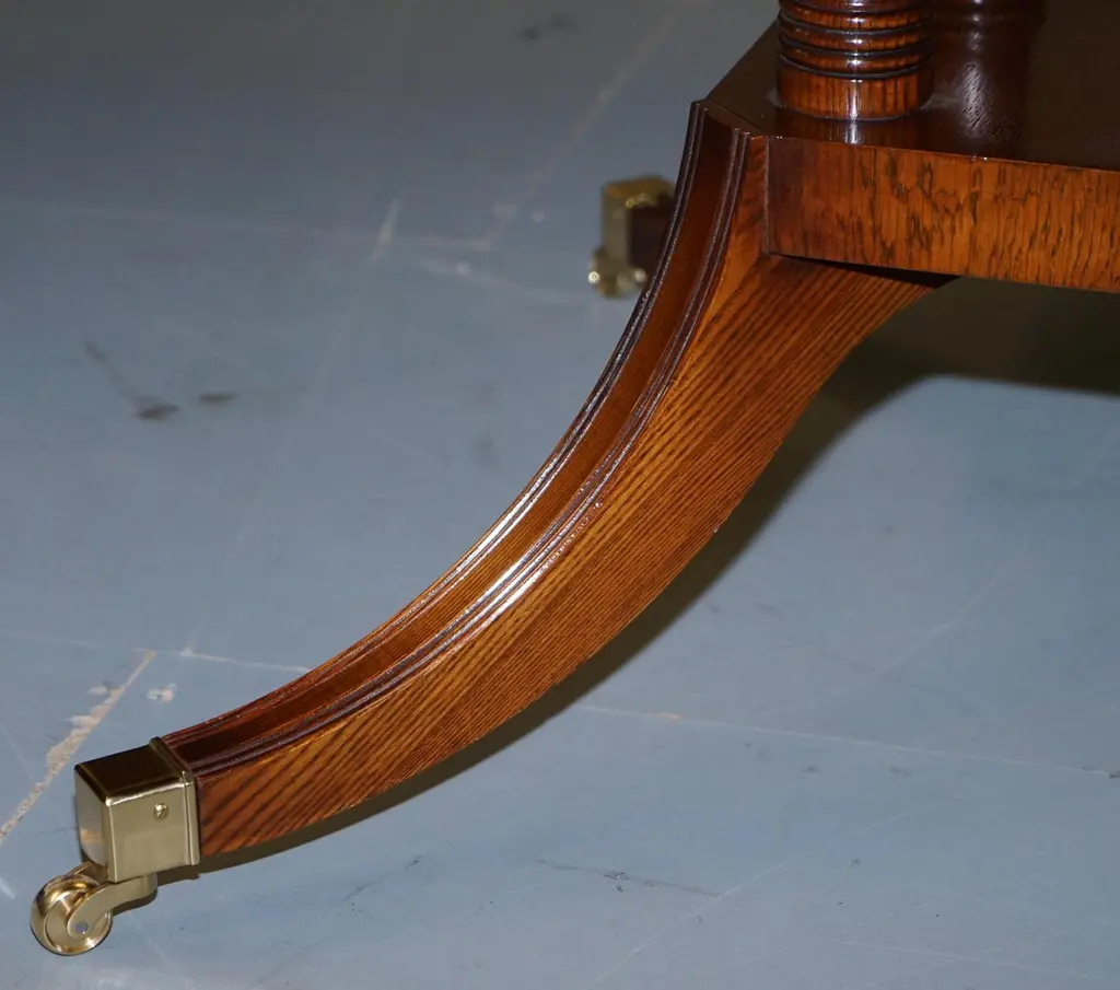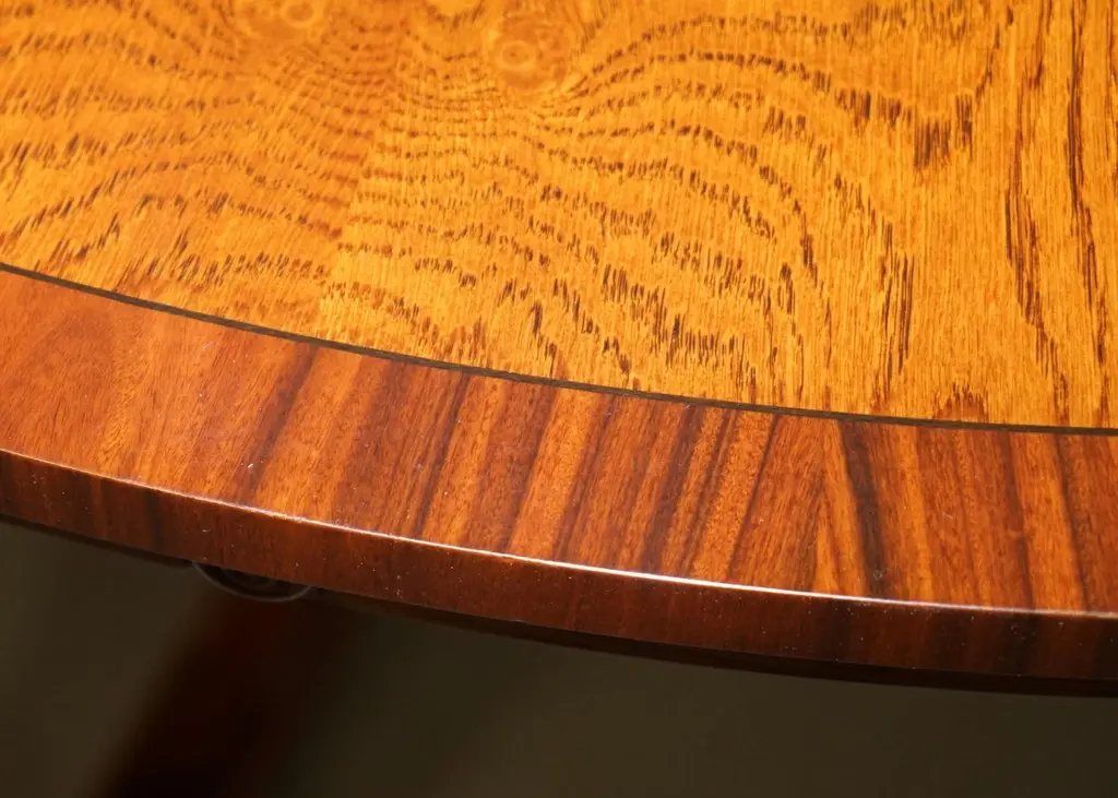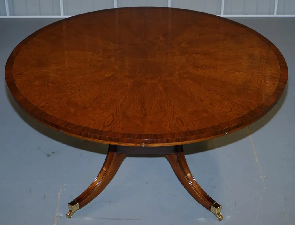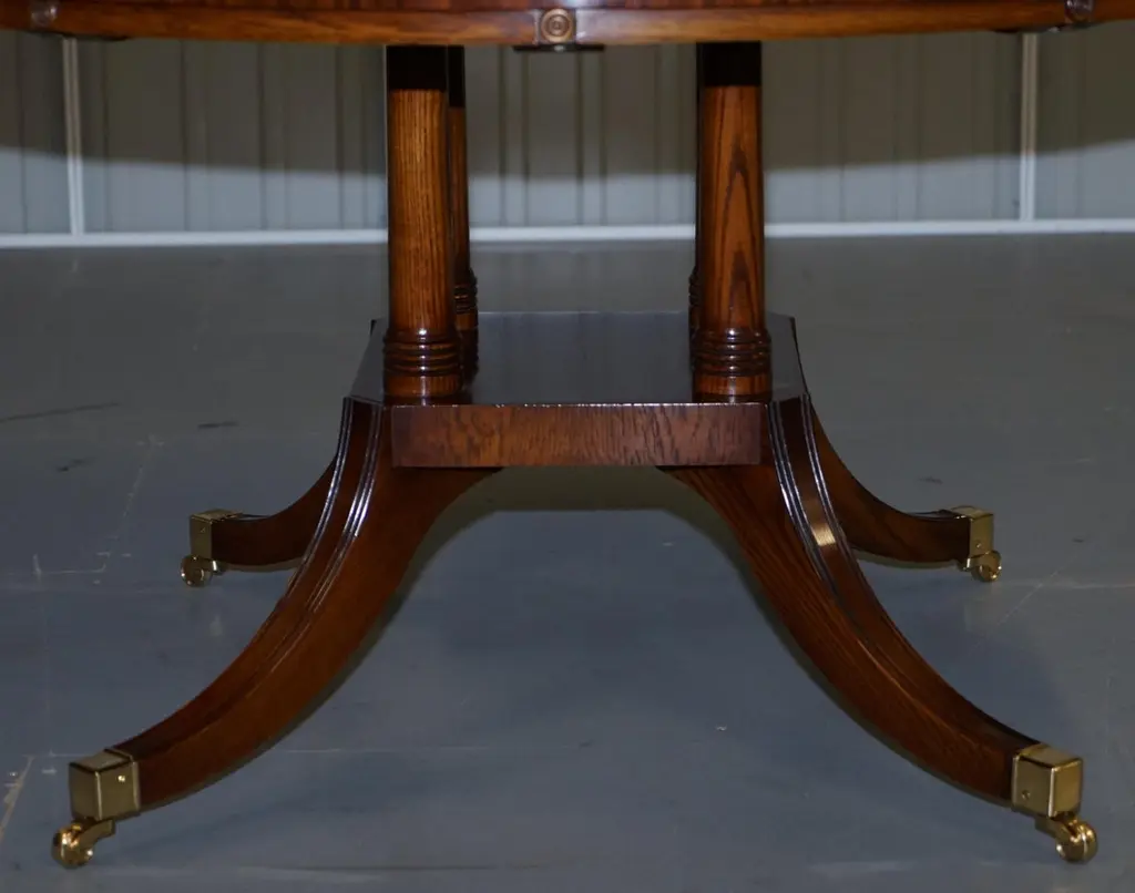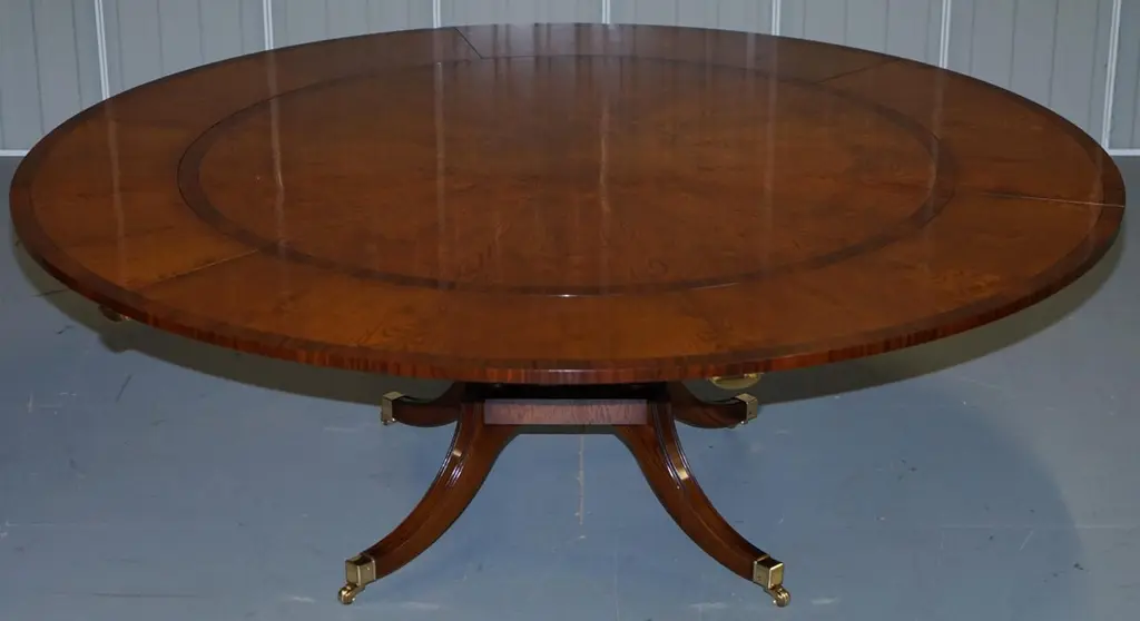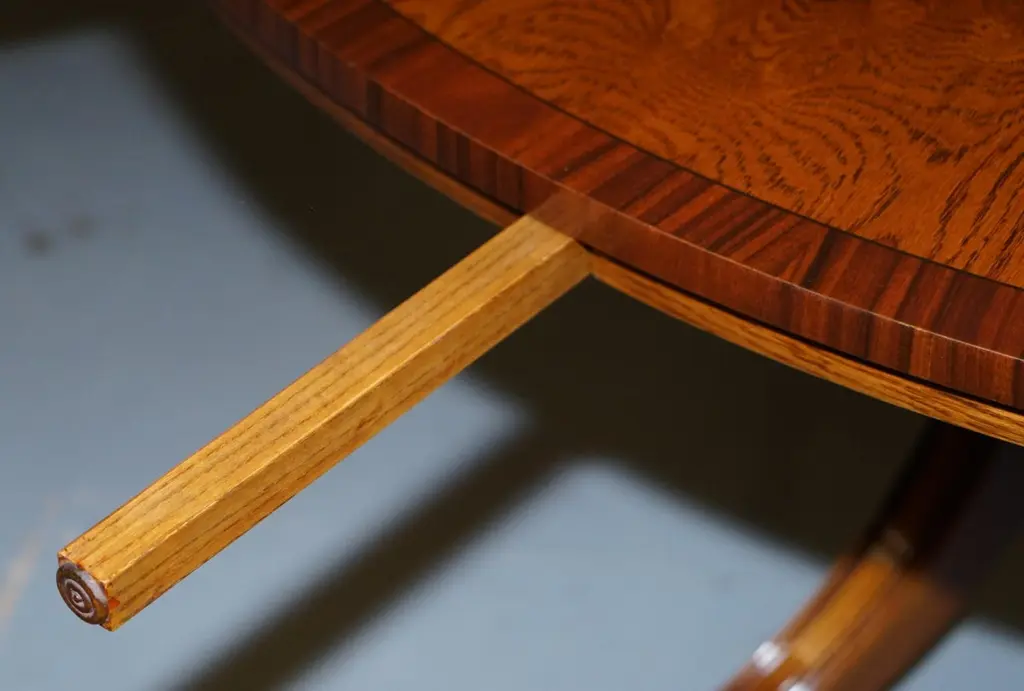 We are delighted to this stunning brand new cluster oak Jupe round extending dining tableThis table is brand new, I have seven left in the cluster oak and two in flamed mahogany. At the moment all the tables are in the white, what that means is they haven’t been stained and lacquer French polished yet, the table pictured was finished and has already been sold. The finish you see is the natural finish meaning how they would all be finished however they can be custom polished to a color of your choosing should you wish for a lighter or darker shadeThe lead time on the finishing is 2-4 weeks, all the tables come with solid brass handmade in England feet with castors, as you can see there are rather elegant looking solid brass clips between the extension leaf joints, these are in the shape of a square letter C and they hold the leaves in situsThis set of tables are all cluster oak with Santos X banding. All the extension leaves are numbered on the underside and the number of the leaf corresponds to the position number on the base of the table, to fit the extensions leaves you pullout / pull-out the extension gliders, seat the correctly numbered leaf in place and then repeat until all six leaves are in place, you then fit the solid brass clips and away you goDimensions:Height 76.5cmWidth 150.5cm extending to 213.5cmUnder tabletop height 74.25cmPlease note all measurements are taken at the widest pointThis item is available for collection from our Wimbledon warehousesCondition:Please view the very detailed pictures as they form part of the description around conditionPlease note vintage period and original items such as leather seating will always have natural patina in the form of cracking creasing and wear, we recommend regular waxing to ensure no moisture is lost, also hand dyed leather is not recommended to sit in direct sunlight for prolonged periods of time as it will dry out and fade.