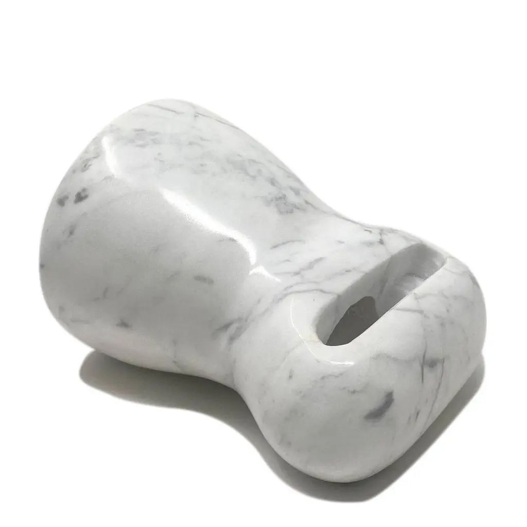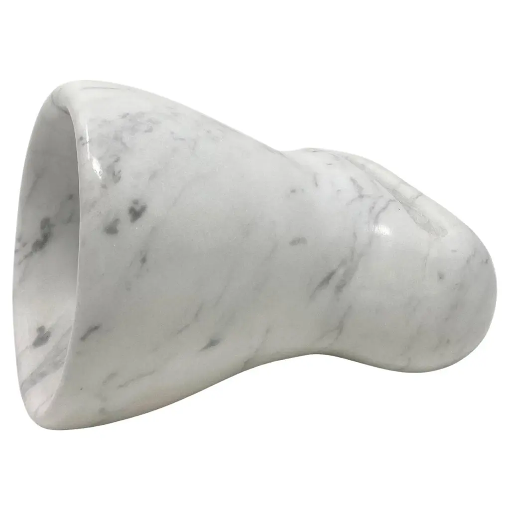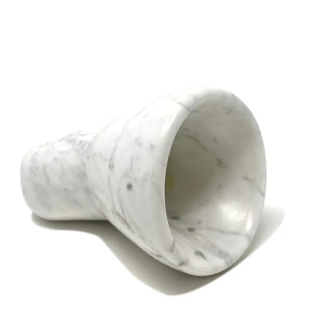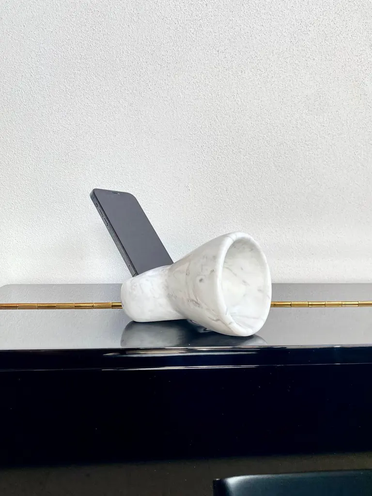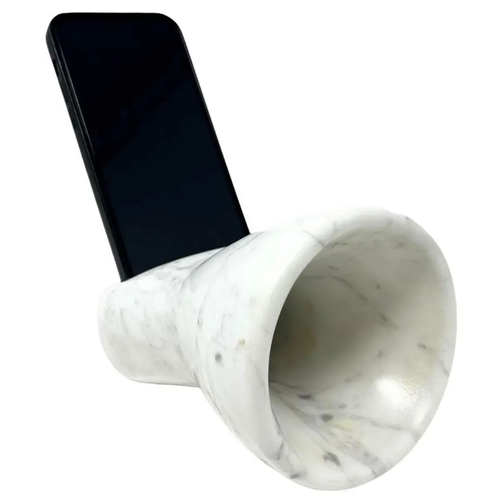 The Brass amplifier, entirely made of Calacatta Oro marble, is an exclusive and elegant design object that acts as a passive amplifier for your smartphone. To use this object, just turn on the music on your smartphone and place it in the appropriate support and enjoy an amplified volume thanks to the physical principle of acoustic waveguides, without any electronic aid. The Brass amplifier is part of the new ""Brass"" Tablewear & Desk Accessories collection, created through the reuse of different types of natural stones. Through these objects we want to offer our customers objects of sustainable design, to give a touch of elegance and refinement to their dining room or office. Entirely made with residual materials from other projects, the Brass collection, created in collaboration with the designer Cristina Romanello, is made up of exclusive trays, placemats, cutting boards, cutlery trays, coasters, place cards and pen holders designed to give more class and elegance to your table or at your office.(Variations in color or slight imperfections are the result of the craftsmanship of this article and are not to be considered defects)