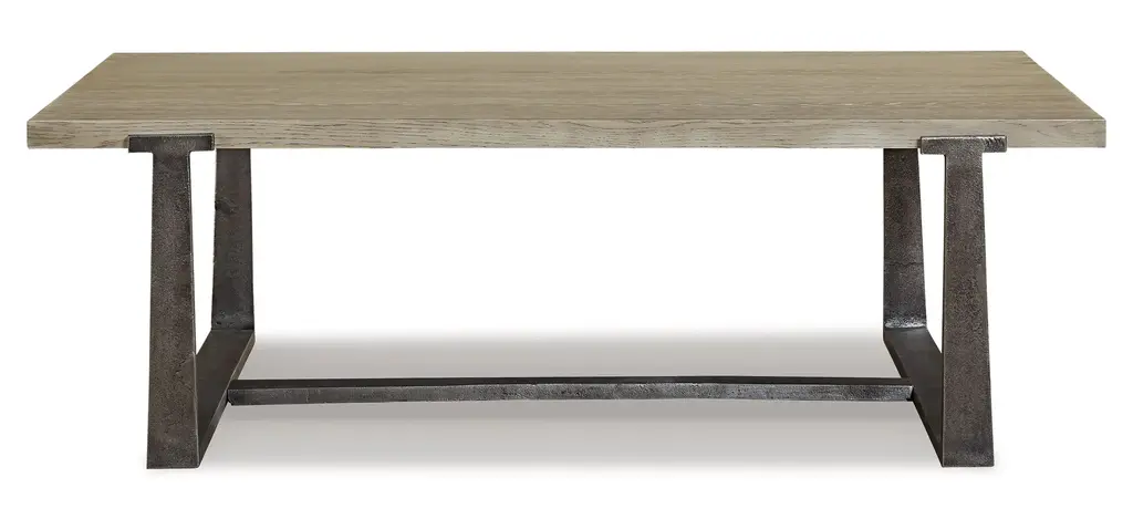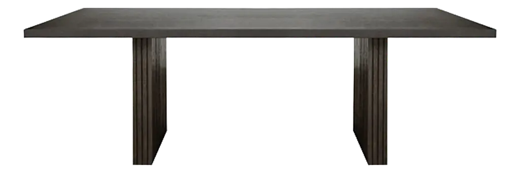 Wide, plank-style legs of brass-finished stainless steel feature an ombre pattern for eye-catching effect, with an intersecting beam adding intrigue. A rectangular black oak tabletop flaunts its materials' natural graining, for a richly organic takeaway.