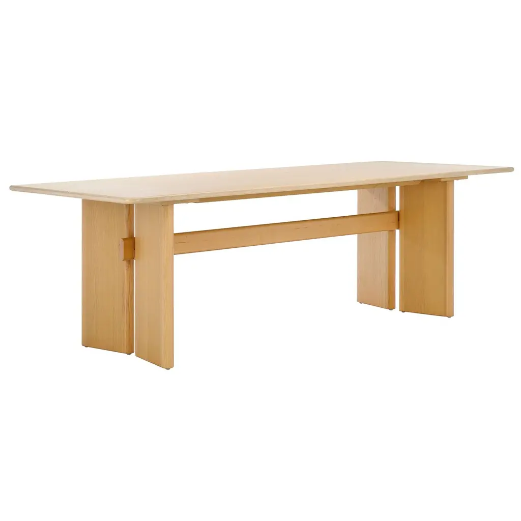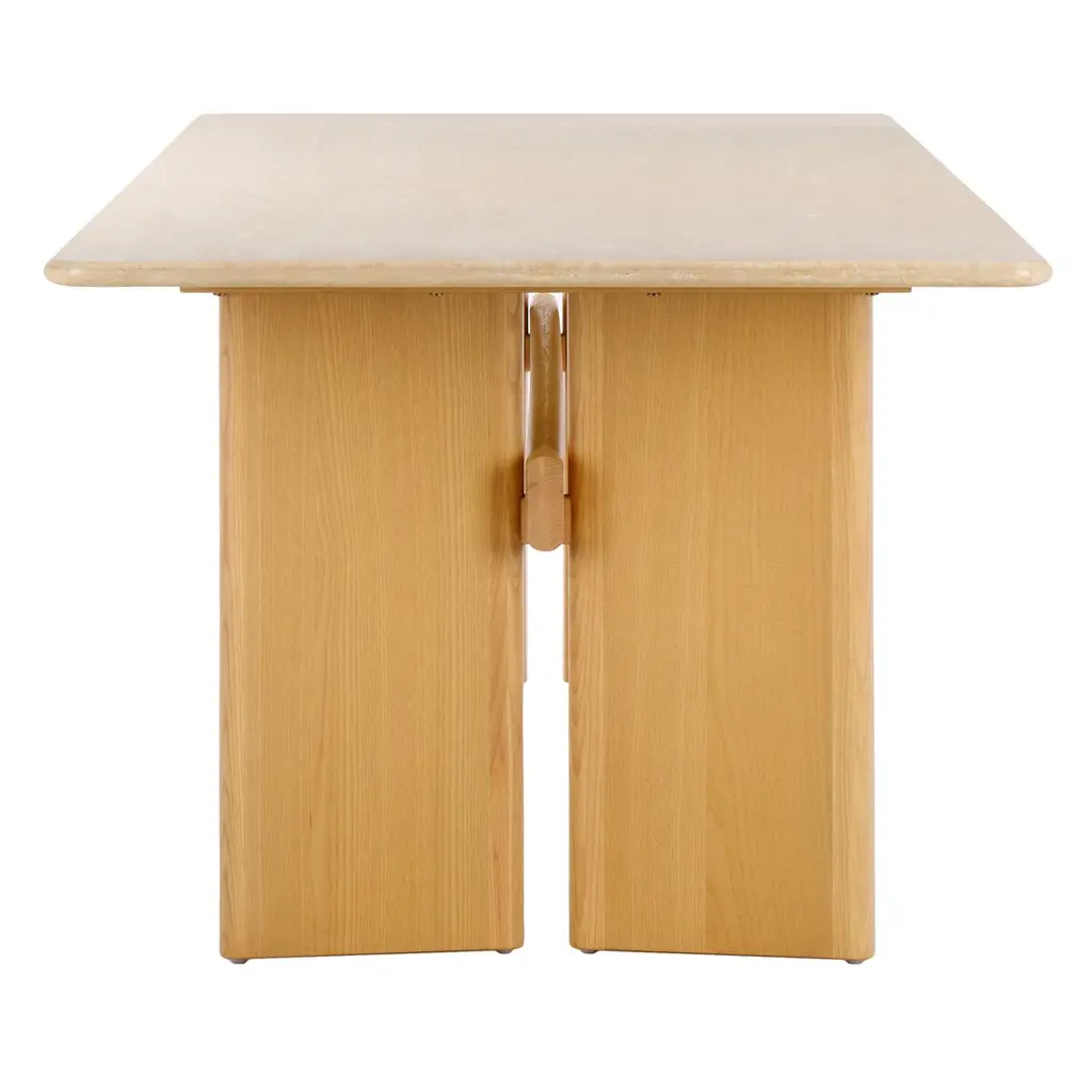 Give a modern and sophisticated edge to your dining space with our Bria dining table. The sleek and modern profile of the table is elevated with a luxe mix of materials. Its rectangular tabletop showcases the earthy tone and distress marks of travertine. The tabletop appealingly complements the natural warmth of thick-cut ashwood legs. Offering a warm and neutral palette, the dining table attains a welcoming and stately stature in any room. Seating up to 8 individuals, the table allows you to host your guests in style.