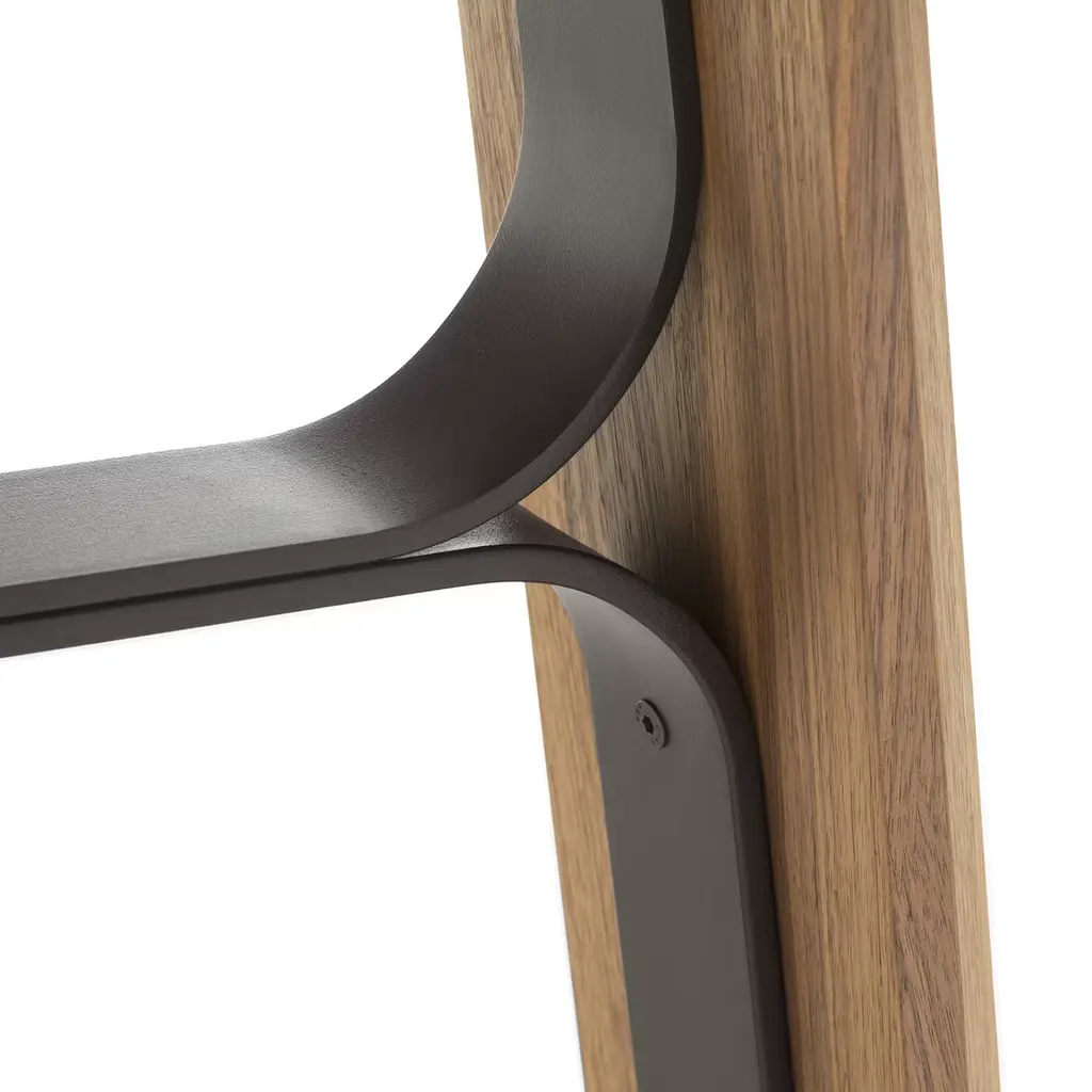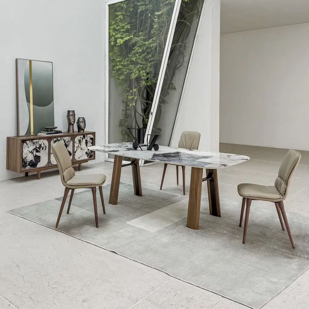 A painstaking attention to detail borrowed from haute couture distinguishes this sophisticated dining table. Featuring bold Canaletto walnut-veneered legs, it stands out for the minute Patagonia marble-effect print impressed on its tempered glass tabletop, surface overlying a lacquered MDF panel blunted by hand (60°). Curved, burnished metal beams varnished with epoxy powders reinforce the design.