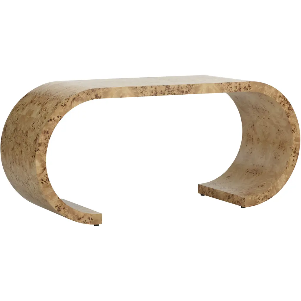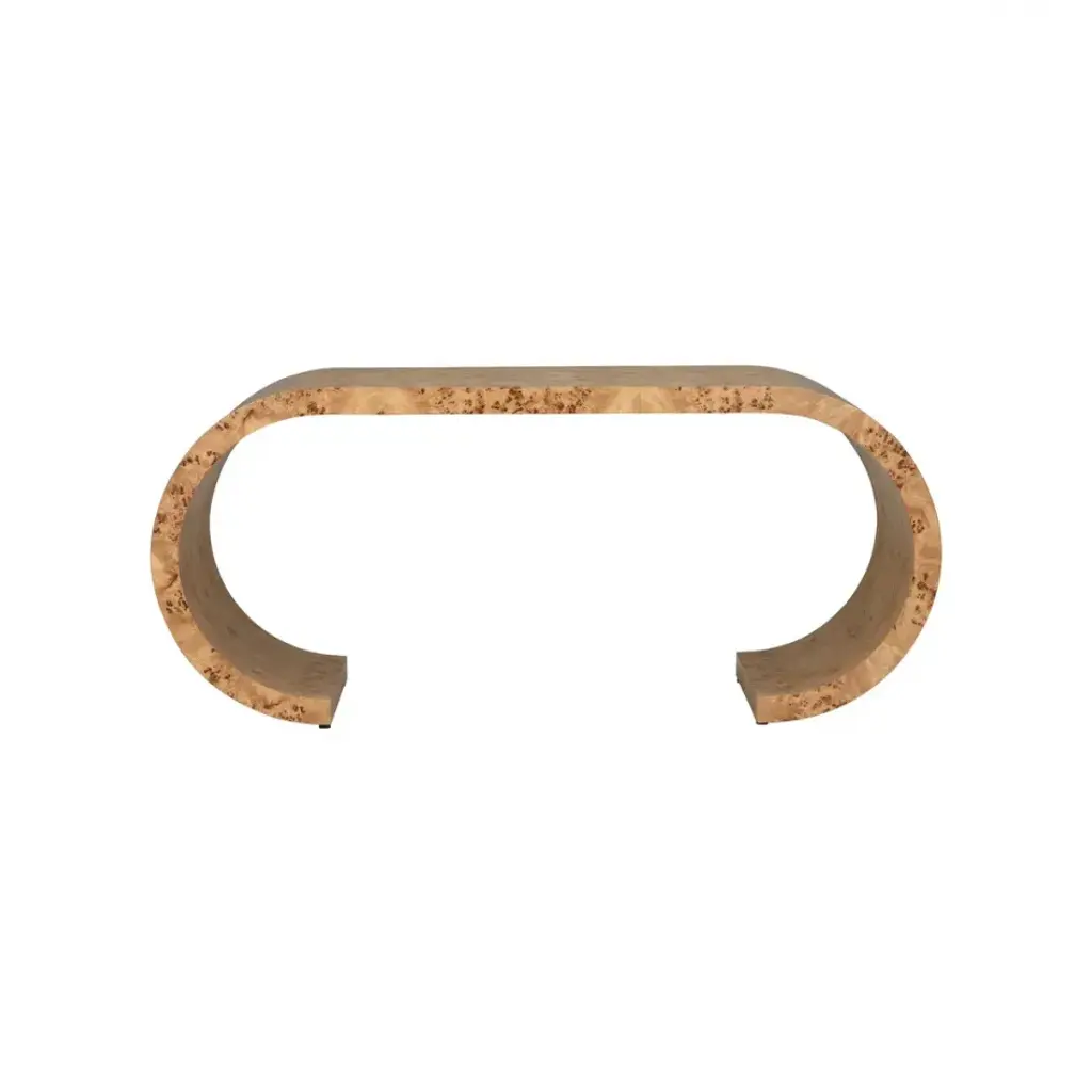 The rounded sides create a striking visual focal point that draws the eye and adds depth to any space. The light burlwood veneer finish lends a warm and inviting ambiance to any room. Whether used as a dining table, entryway statement piece, or as a stylish surface for displaying decorative accents, our Bridges Console is sure to elevate any space with its natural beauty and understated elegance. Designed by Bill Cain.
