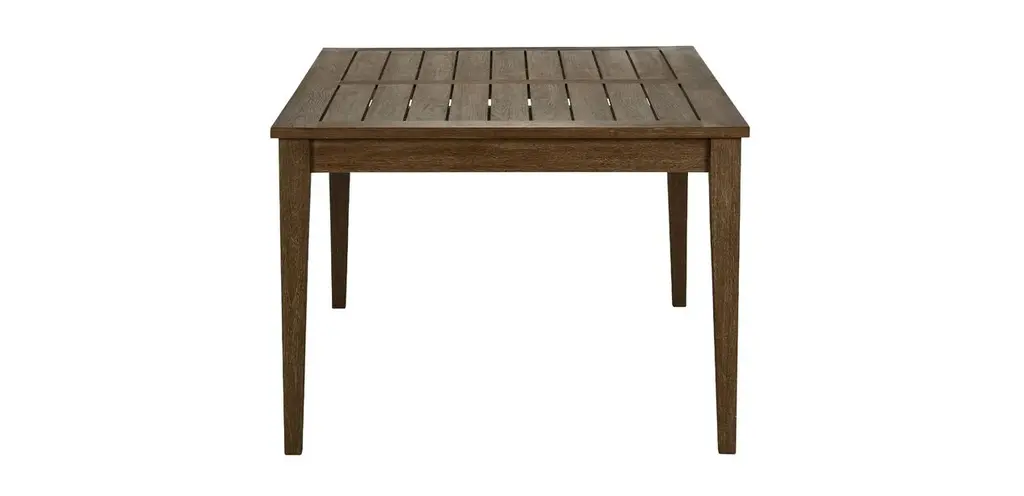 Modern design goes alfresco in this sleek teak outdoor dining table. Clean lines and tapered details deliver striking simplicity. Featuring a slatted top, hidden hardware, and a rich, wire-brushed finish, this teak dining table serves up an elegant streamlined look that blends beautifully with any style—and any scenery!