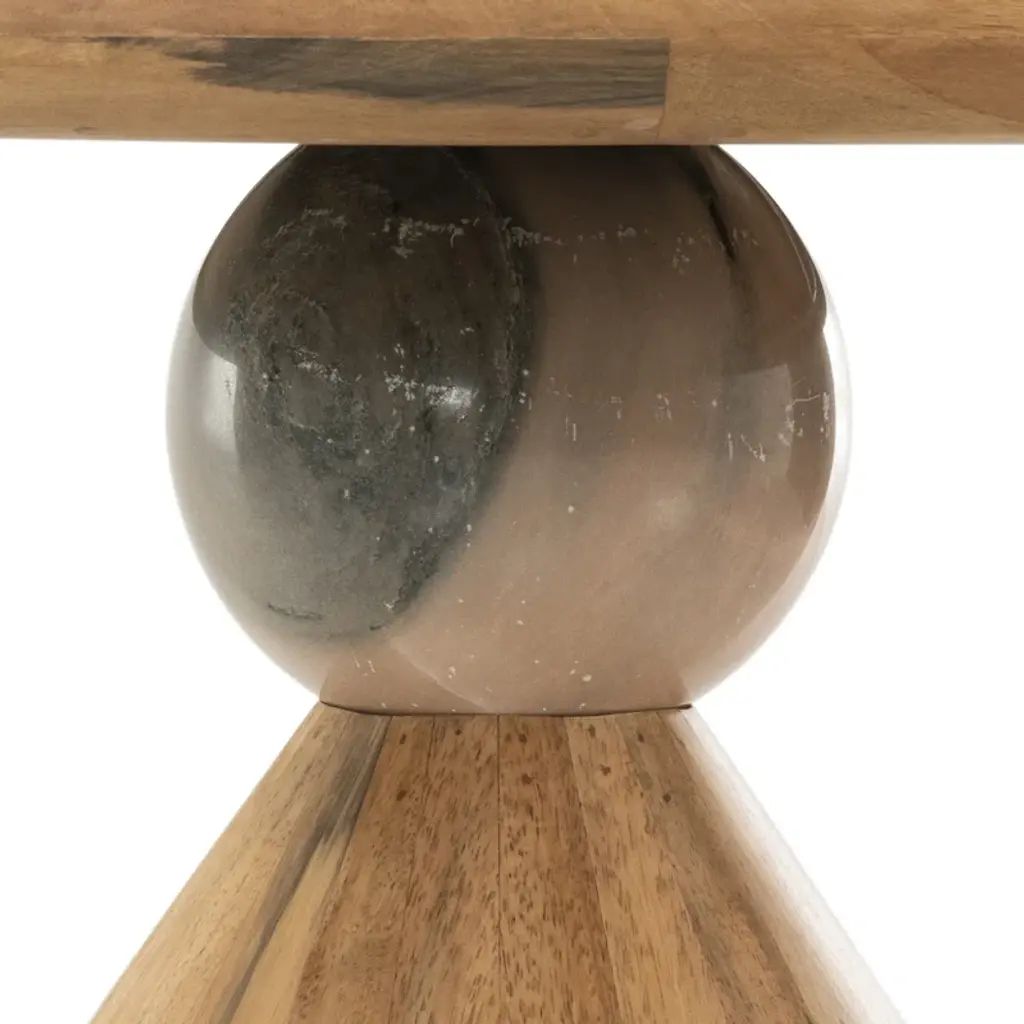 The organically shaped pedestal table takes aesthetic cues from nature. The character-rich knots and grains from manufactured woods are retained for display on a dramatically tapered base, while a dark brown finished base pairs with a lighter tabletop for a fresh contrast of tone.