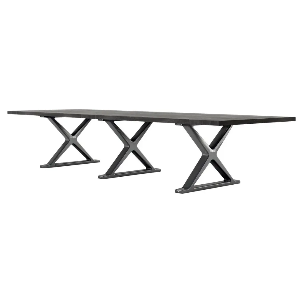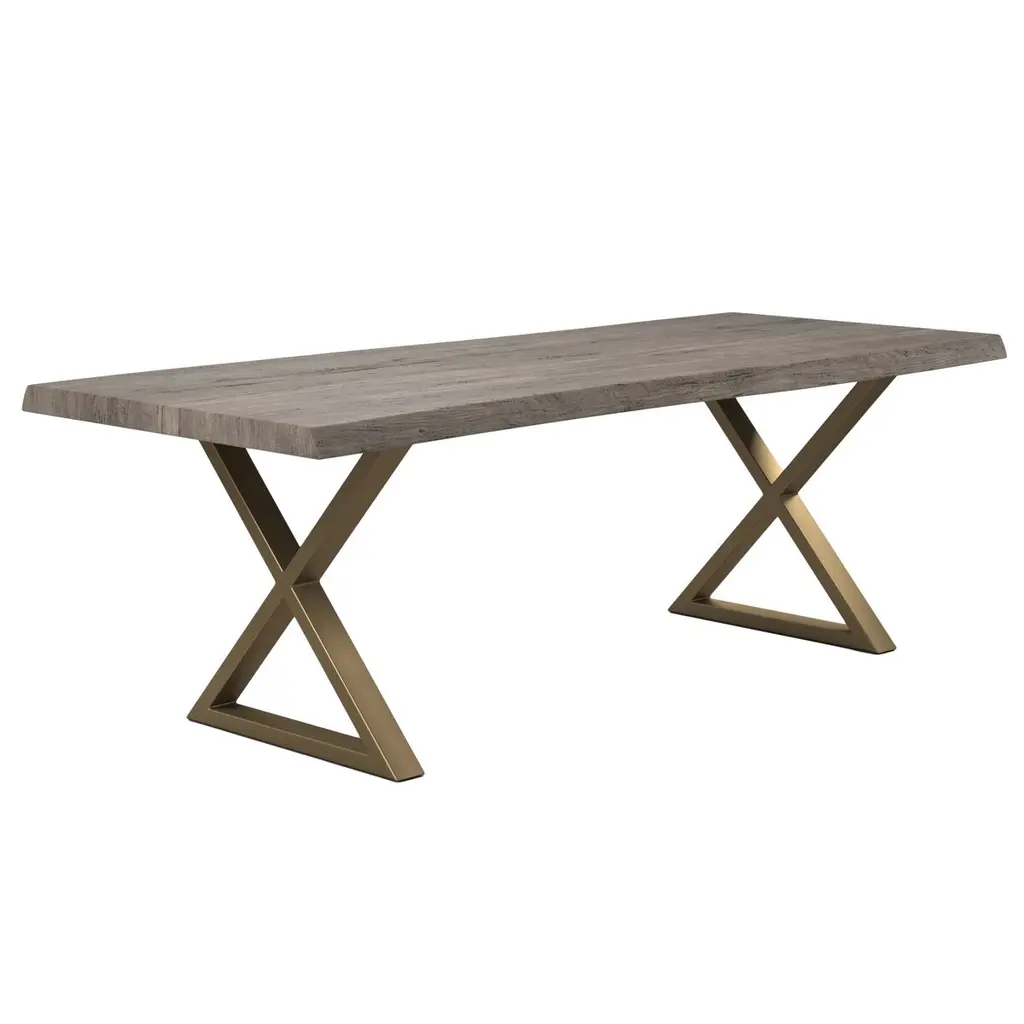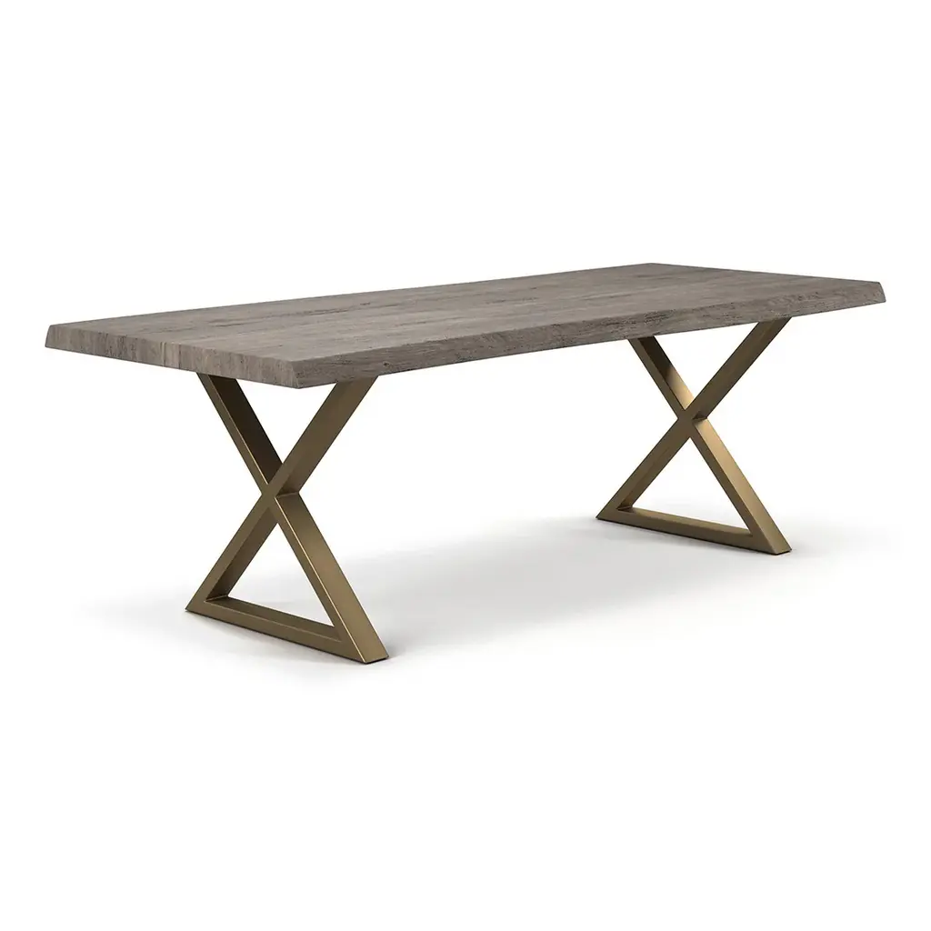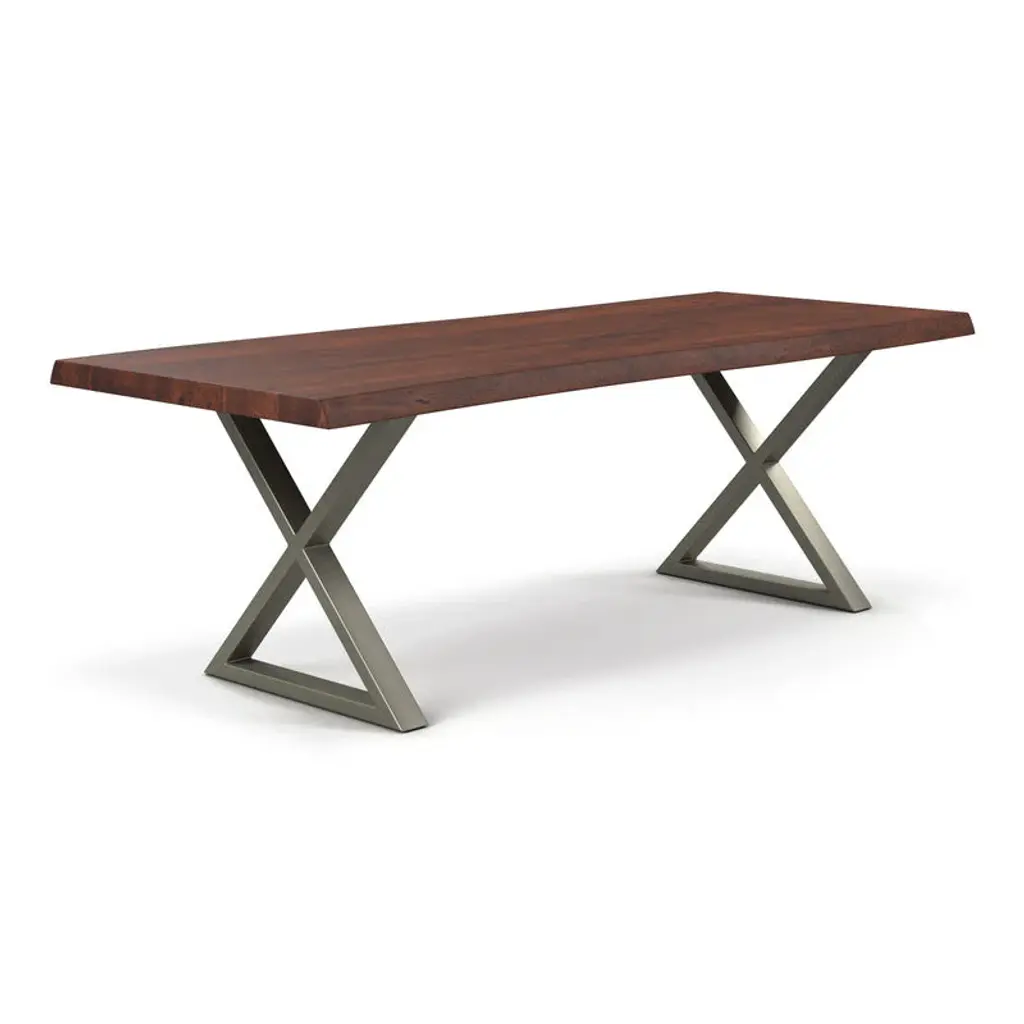 Gather friends and family around the unique Brooks Dining Table X-Base from Urbia. Inspired by rustic charm, this exquisite piece is expertly crafted from solid hardwood and finished in a range of rich wood hues. Its distinctive patterns and natural knots showcase a refined complexity, while a metal base adds an air of industrial sophistication. Perfect for any space, this elegant table is sure to leave a lasting impression. Highlights