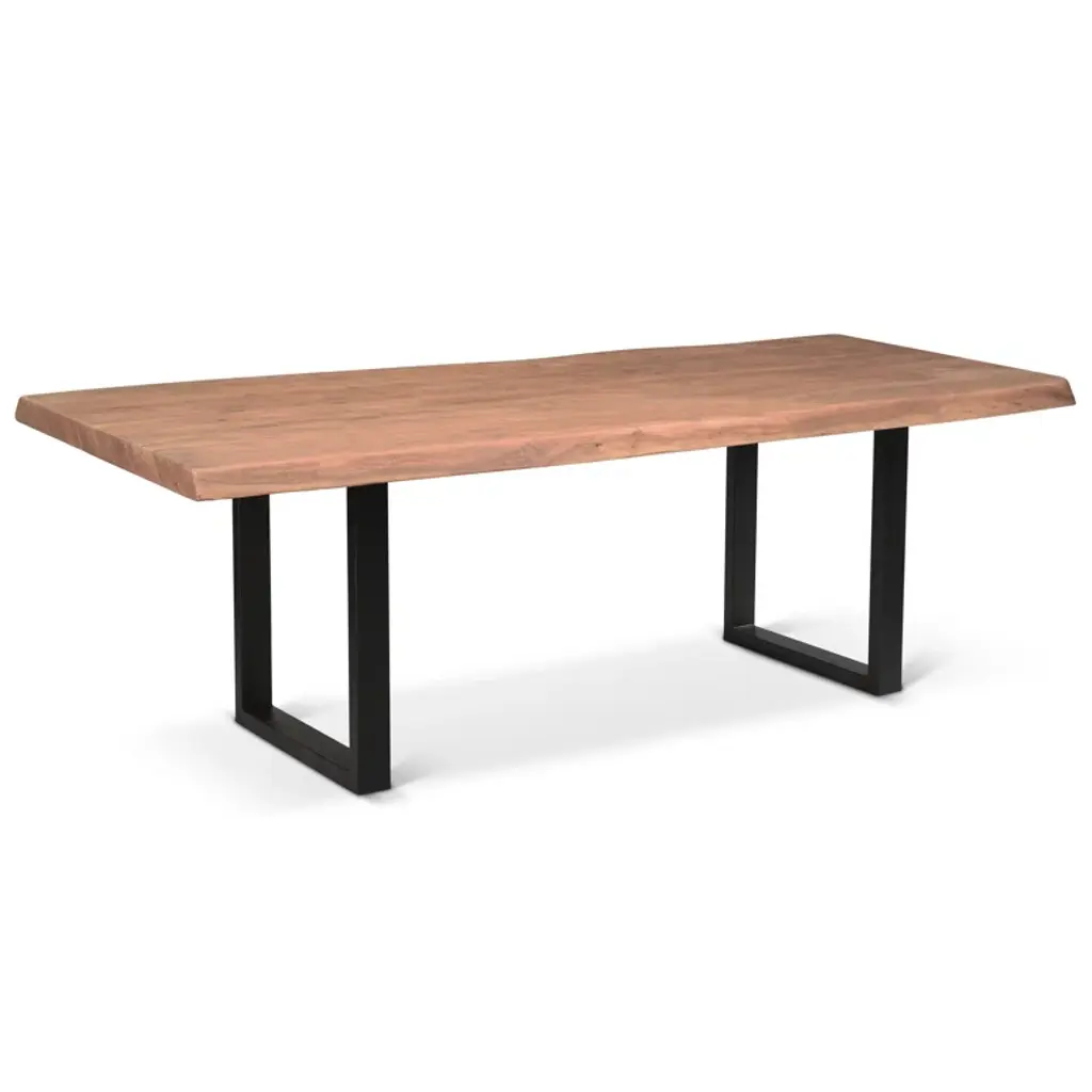 Bring modern simplicity to your dining space with this solid acacia wood table. Supported by a sturdy metal pedestal base, the table's design easily accommodates guests. Gather around this table, perfect for sharing meals and making memories.