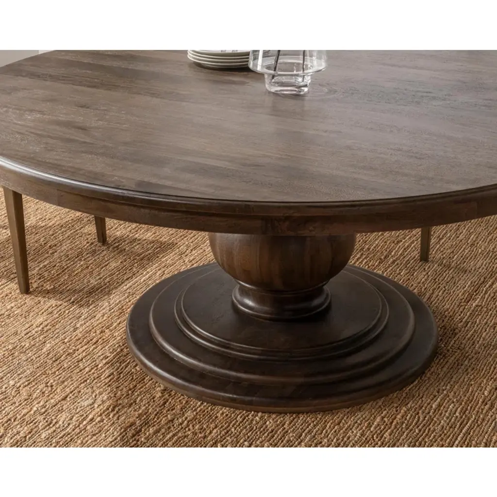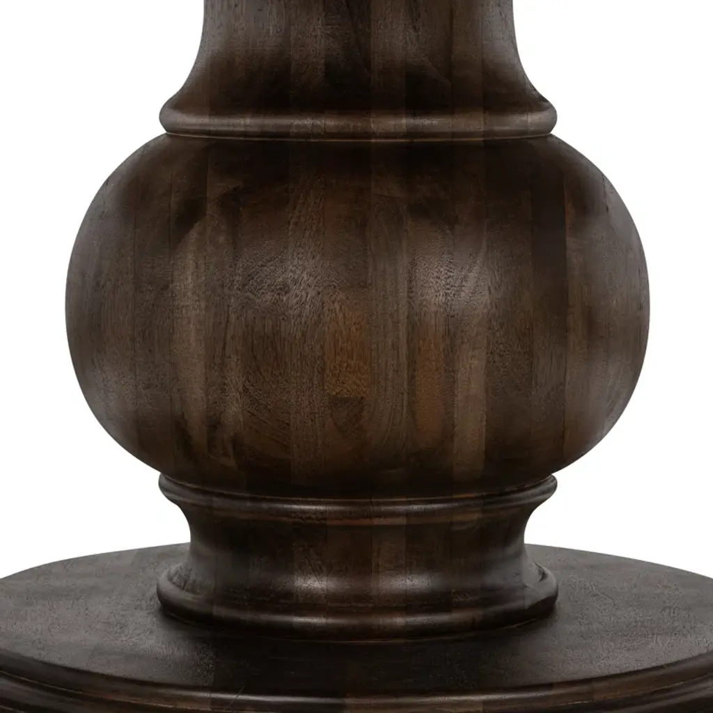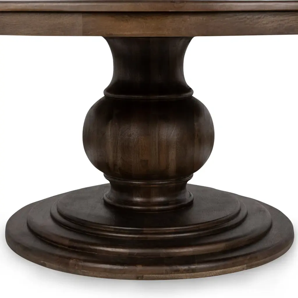 Defined by its beautifully turned base, this dining table epitomizes the timeless beauty of traditional design. Solid mango wood construction and a hand-applied finish offer exceptional durability while capturing and preserving the energetic grain patterns and color variation of the wood, making this piece an elegant addition to any dining space.