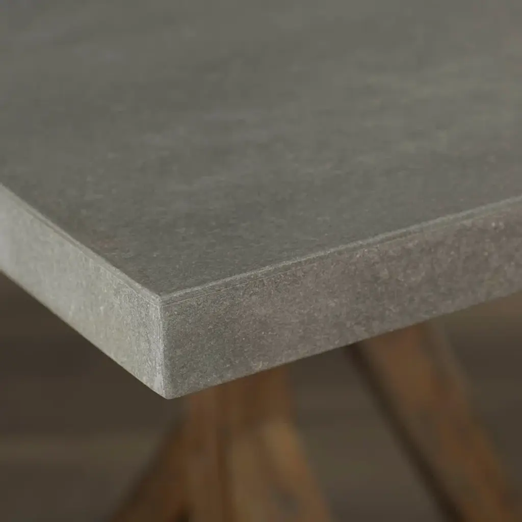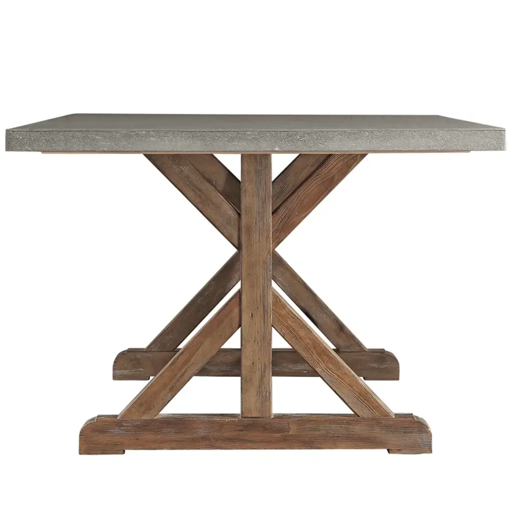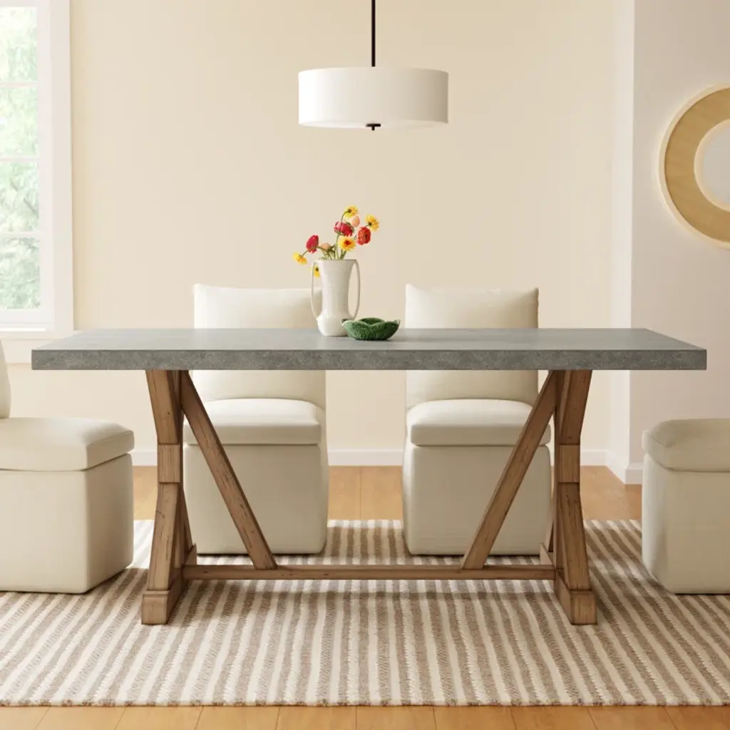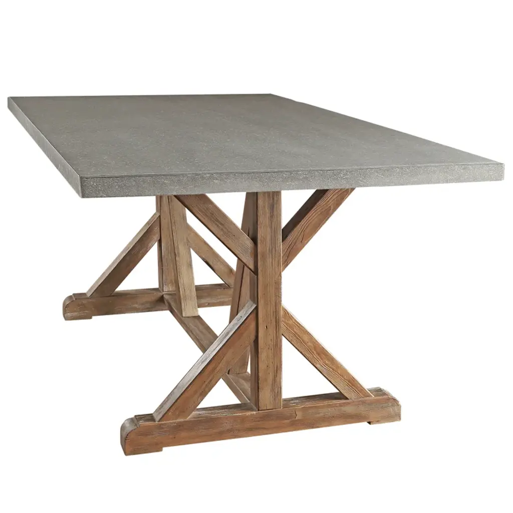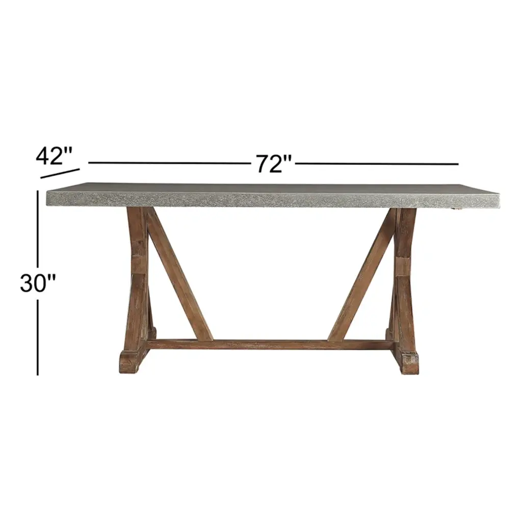 This trestle-style dining table brings a rustic touch to your family gatherings. With seating for six, it's the ideal spot for sharing meals and making memories. The table top is made from a blend of solid pine and engineered wood, showcasing a reinforced concrete veneer for a unique look. Natural wood grain variations and purposeful distressing add character to your dining space. Gather around this table for cozy dinners and lively conversations – it's the heart of your home.