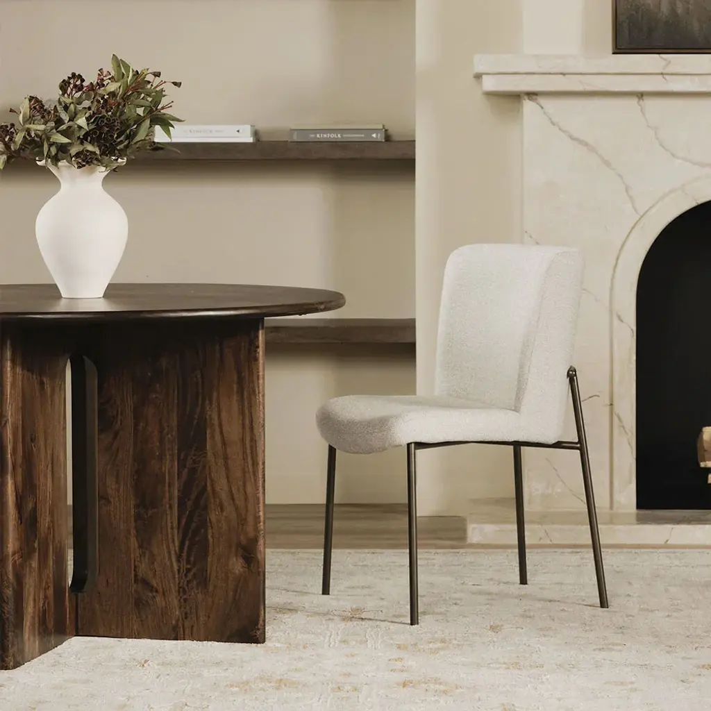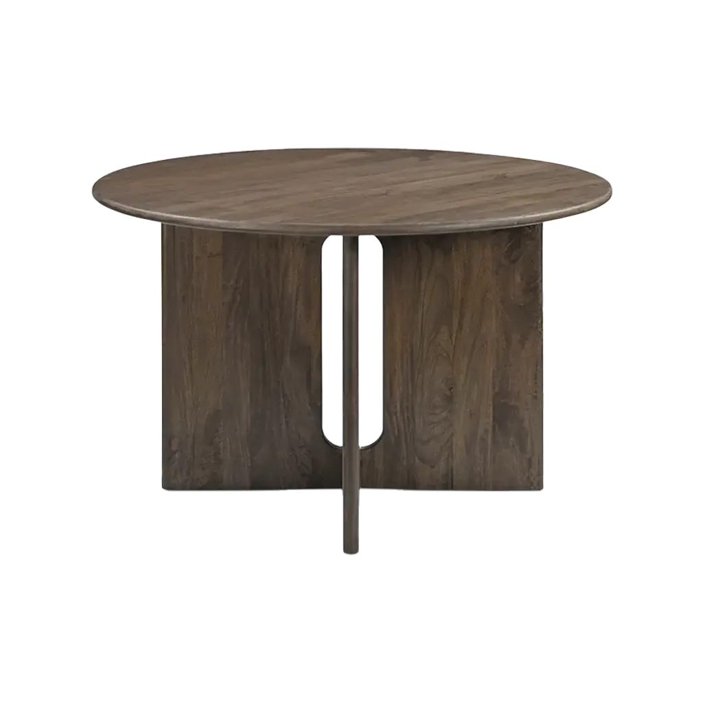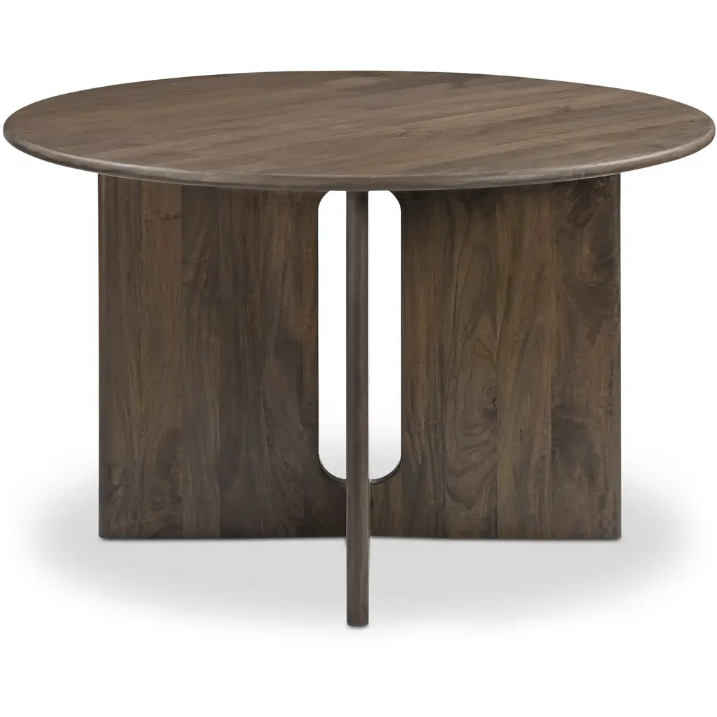 The Bruna Dining Table is a stunning centerpiece for any modern or rustic dining space, featuring a 48" diameter round tabletop with a natural grain finish in warm brown tones. Supported by a pedestal base with cross-leg support, this elegant piece combines timeless craftsmanship with a contemporary minimalist design. Perfect for family gatherings or dinner parties, the Bruna Dining Table is a versatile and inviting addition to your home.