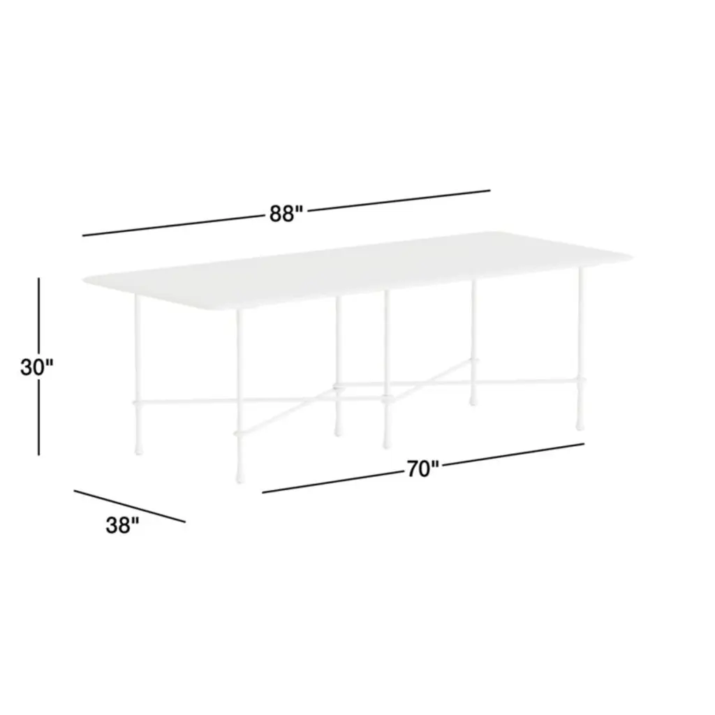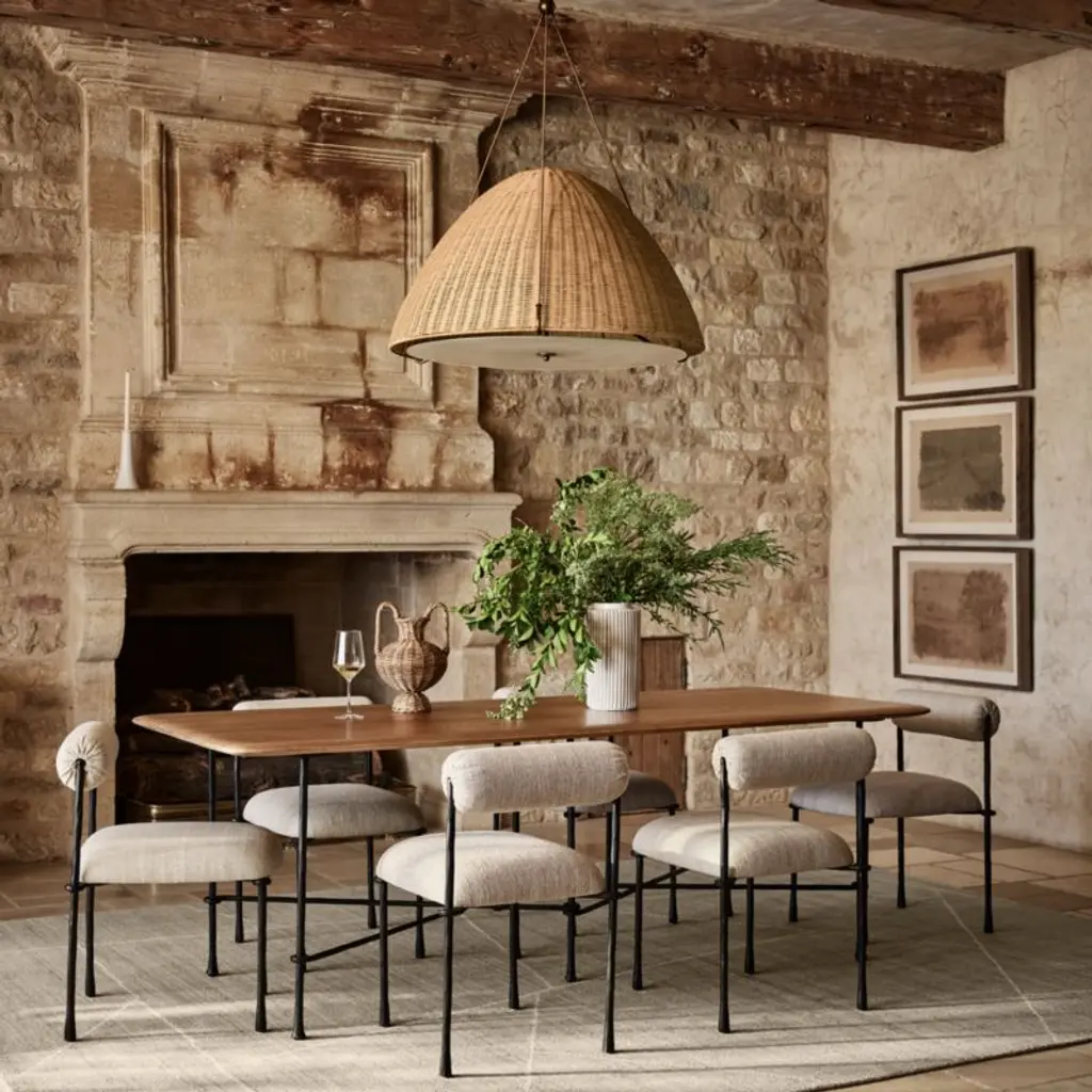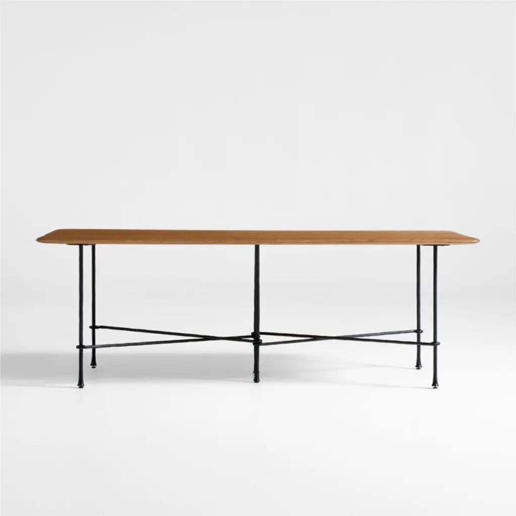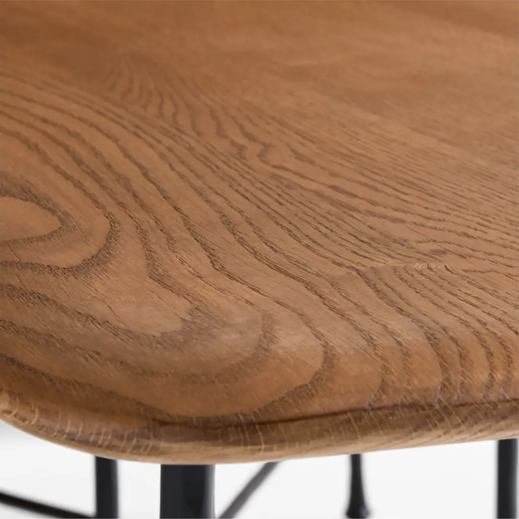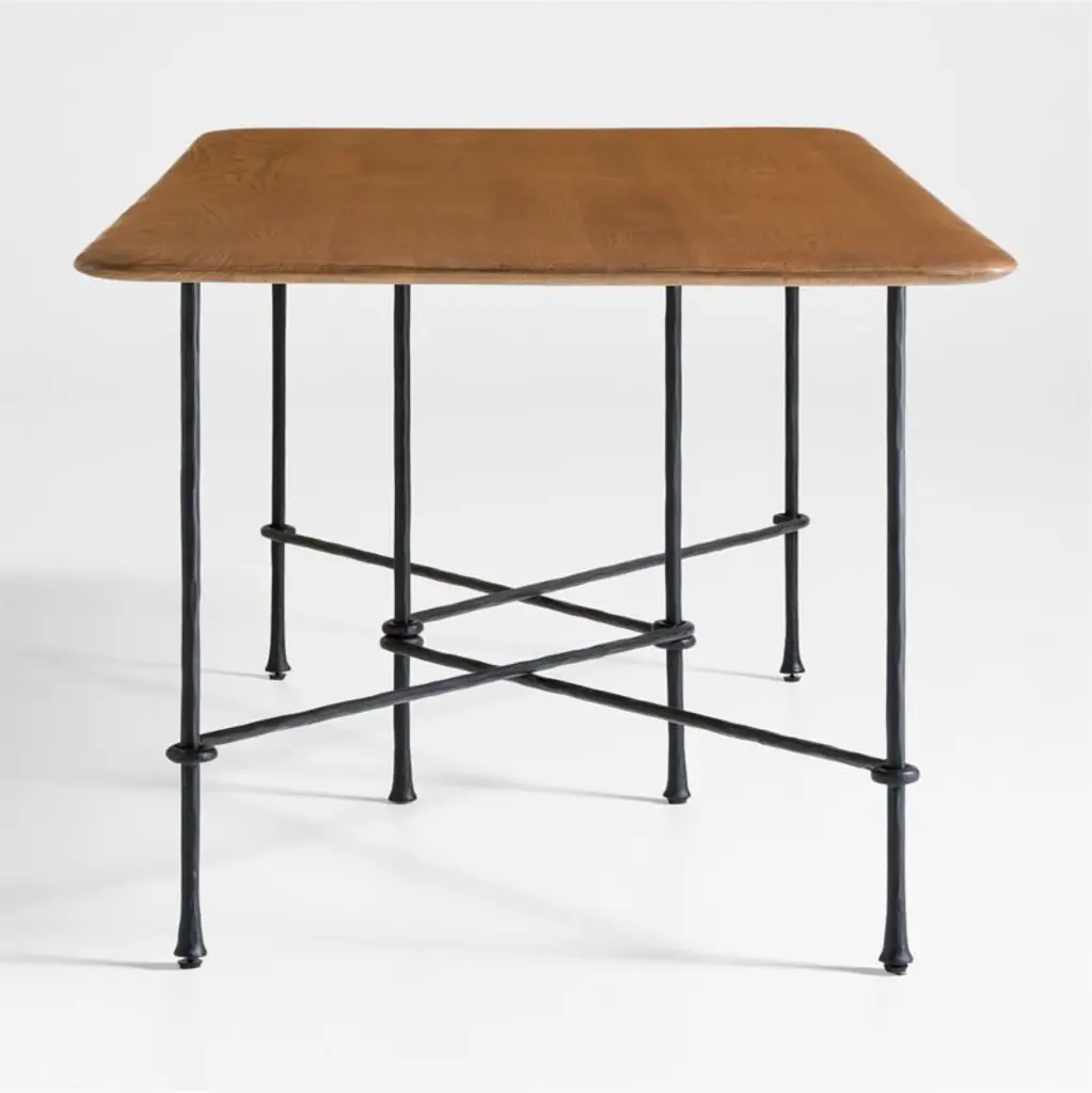 Elevated design meets artisan-like crafting in our Brussels dining table. With the look of foundry-forged metal, the organically textured, black-finished steel frame shapes slim legs that flare to bell-shaped feet and stretcher bars that curl and loop around the legs to form a sturdy foundation. The solid oak top is crafted with rounded elliptical edges and finished with a warm brown stain to bring out the grain as well as the unique tonal variations, knots or superficial cracks that give each table its one-of-a-kind character and organic authenticity.
