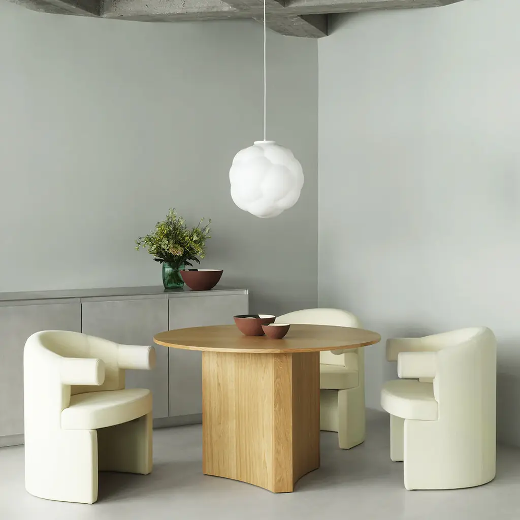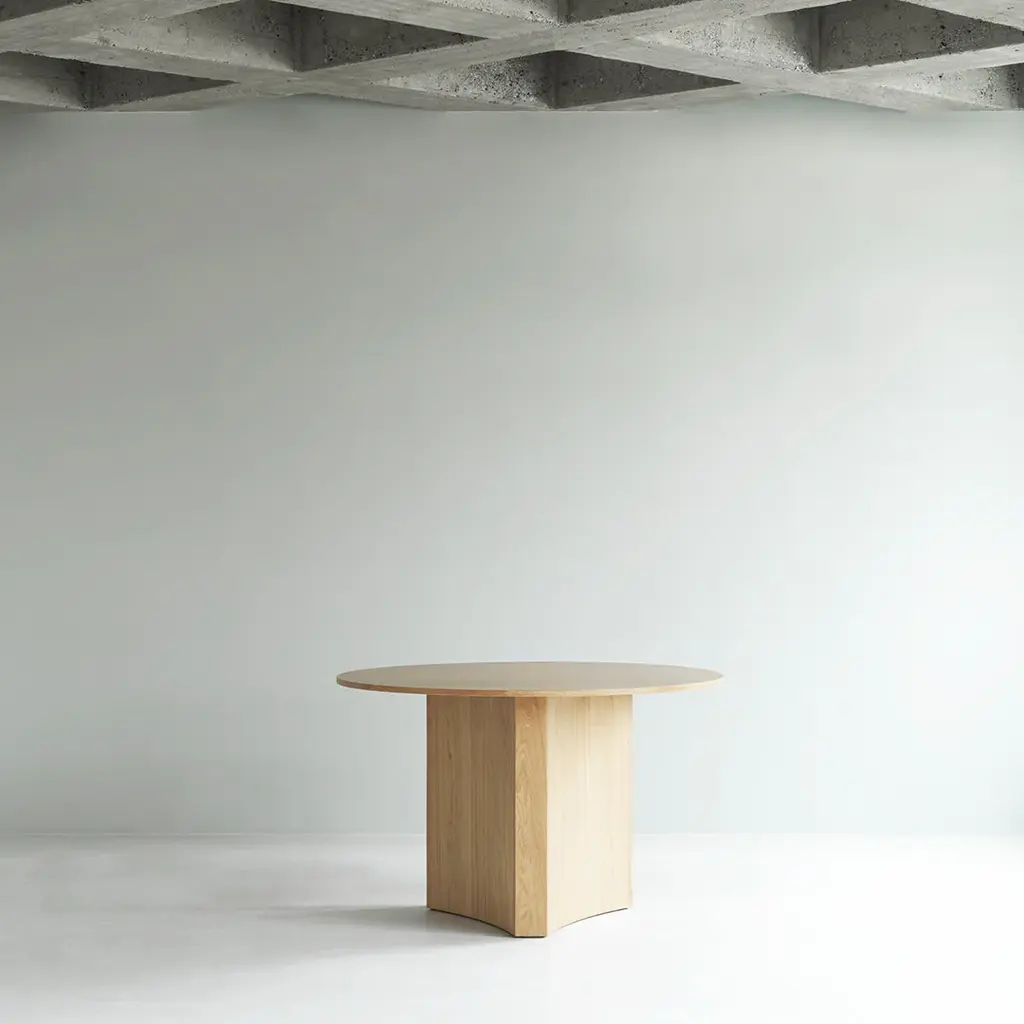Bue Table is a remarkable dining table that embodies sculptural elegance. With its unique design and exquisite craftsmanship, Bue Table offers a captivating centerpiece for any dining setting. Crafted from high-quality oak veneer, Bue Table features a round tabletop resting on a decorative triangular base with rounded sides. This distinctive design optimizes legroom and adds an elegant touch, while enhancing the table's robustness and stability. The harmonious combination of geometric elements and subtle curvatures creates a sculptural and dynamic aesthetic, making Bue Table a captivating focal point in any interior. Meticulously crafted with attention to detail, Bue Table's use of premium oak veneer enhances its natural beauty and ensures long-lasting durability. With its artistic allure and functional design, Bue Table offers a memorable dining experience that seamlessly integrates style and practicality.