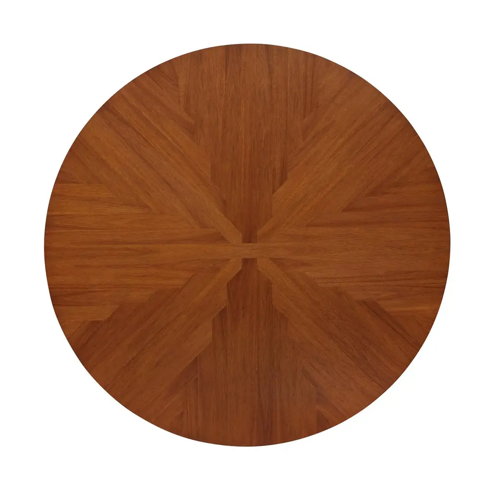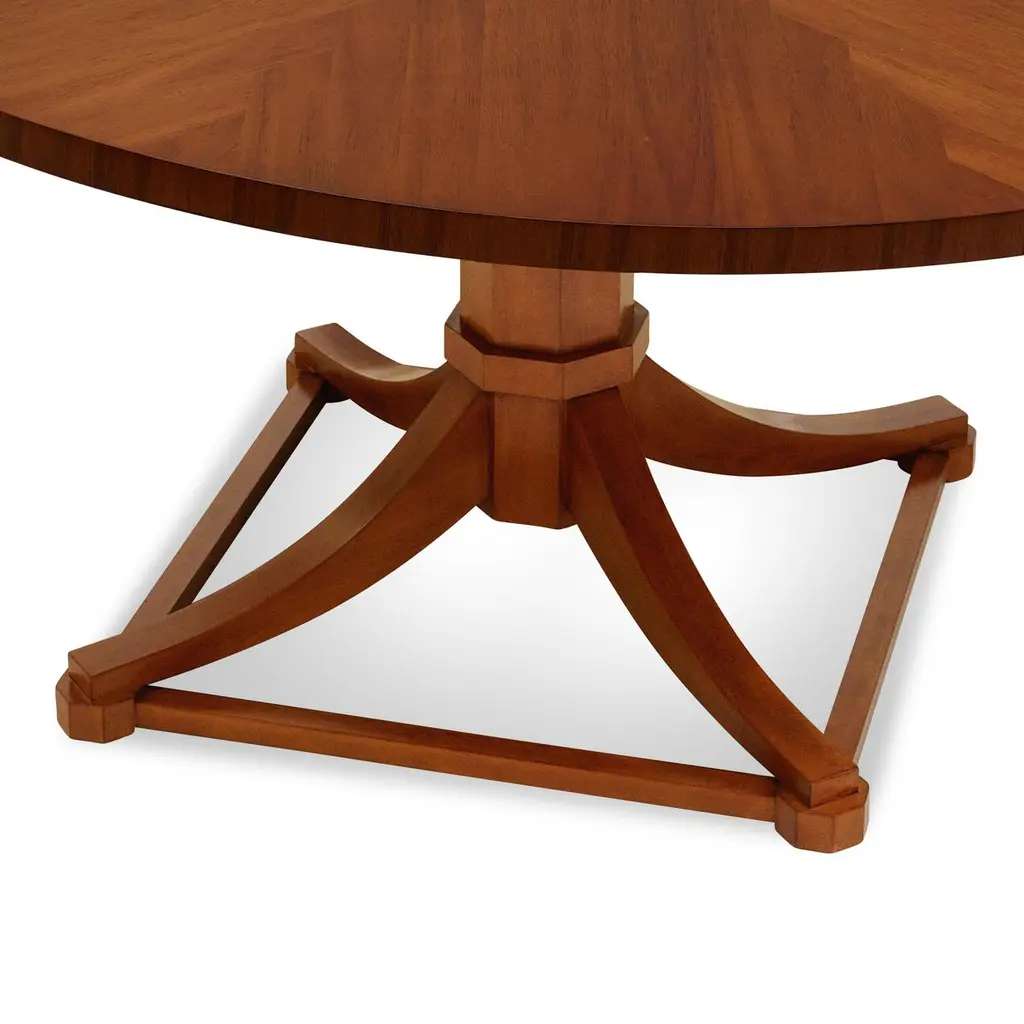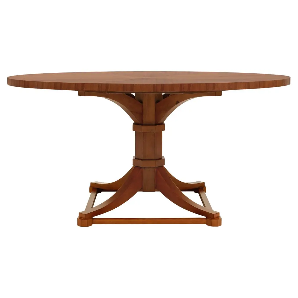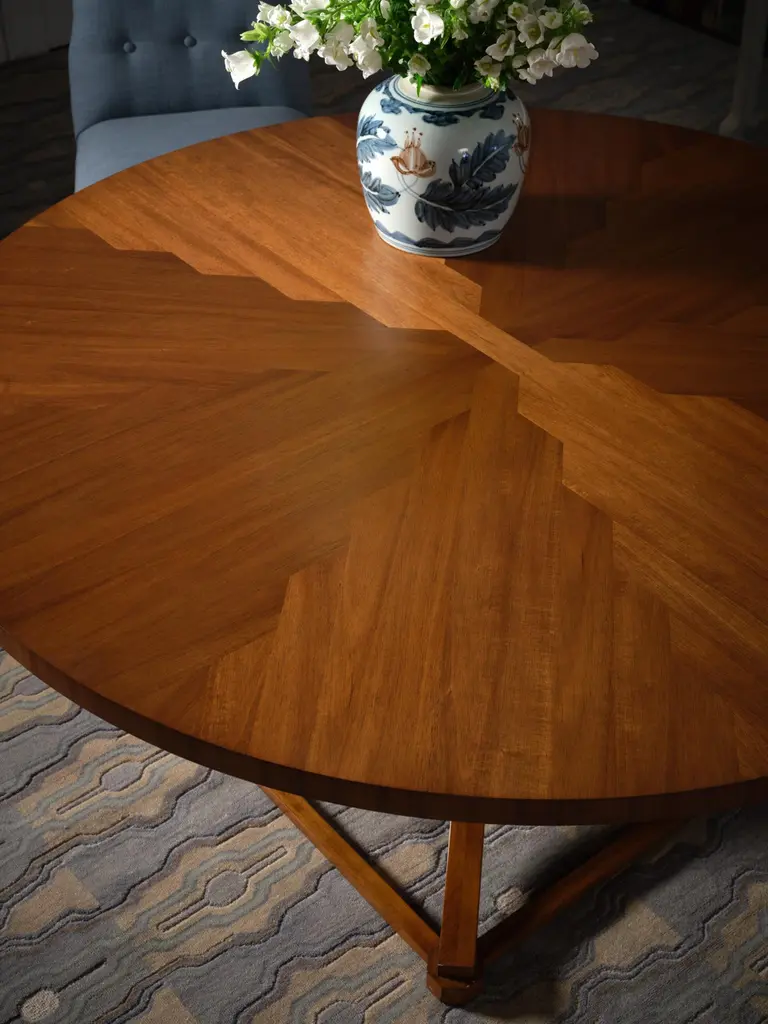 An unusual parquet inlay Bunny discovered inspired our new Tedrick Dining Table, which showcases a stunning radiating chevron-star pattern that commands attention. The rich walnut finish exudes warmth without overwhelming, making it a versatile addition to a variety of interiors. Four elegantly splayed legs extend outward, providing not only sturdy support but also a refined sense of balance and grace. The intersecting stretchers not only fortify the table’s strength but also introduce another subtle geometric detail, enhancing its visual intrigue.
