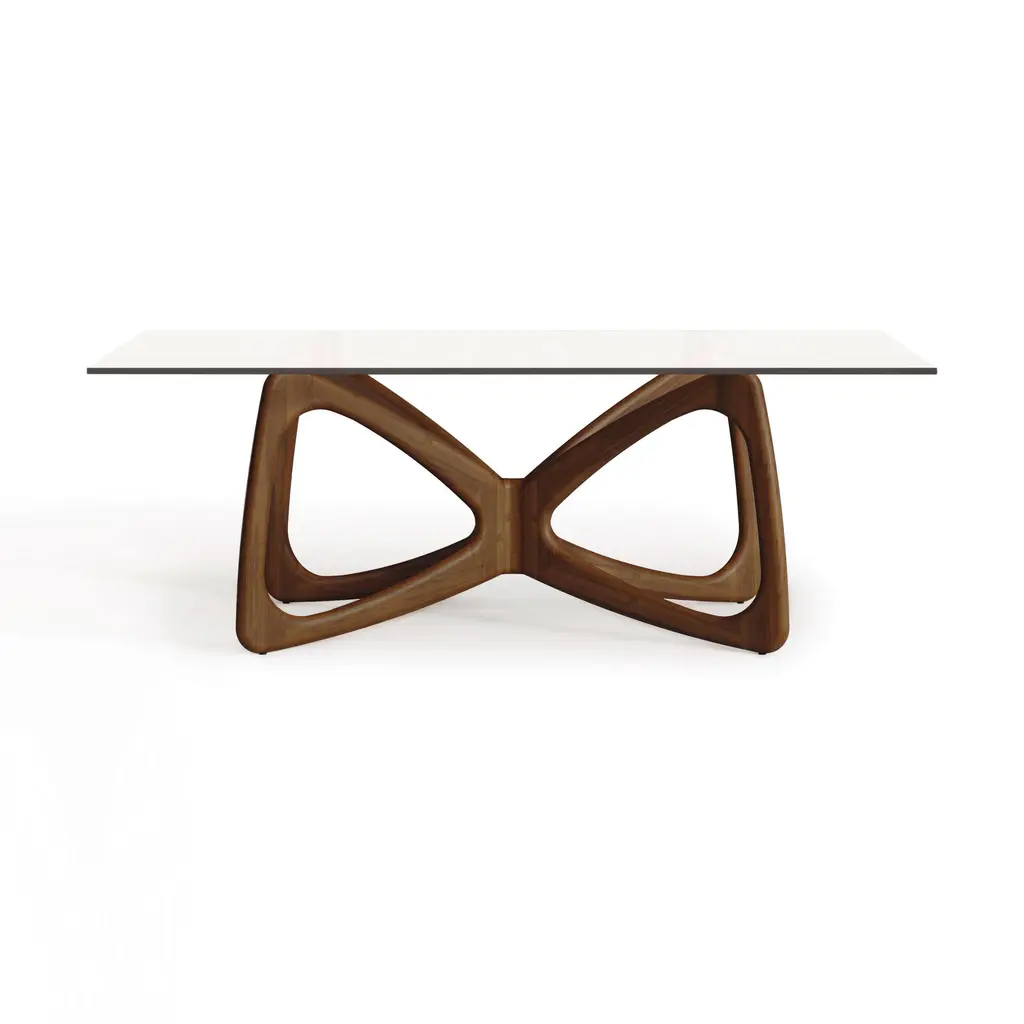 Create memorable meal times with the striking Butterfly Glass Top Dining Table from Copeland Furniture. Crafted with natural inspiration and modern aesthetics in mind, this table is crafted from solid American black walnut hardwood and solid Oak for durability. Perfect for everyday use or as a conversation piece at lively gatherings, the sculptural base of this table is elevated by the spacious glass tabletop for an eye-catching contrast. Highlights