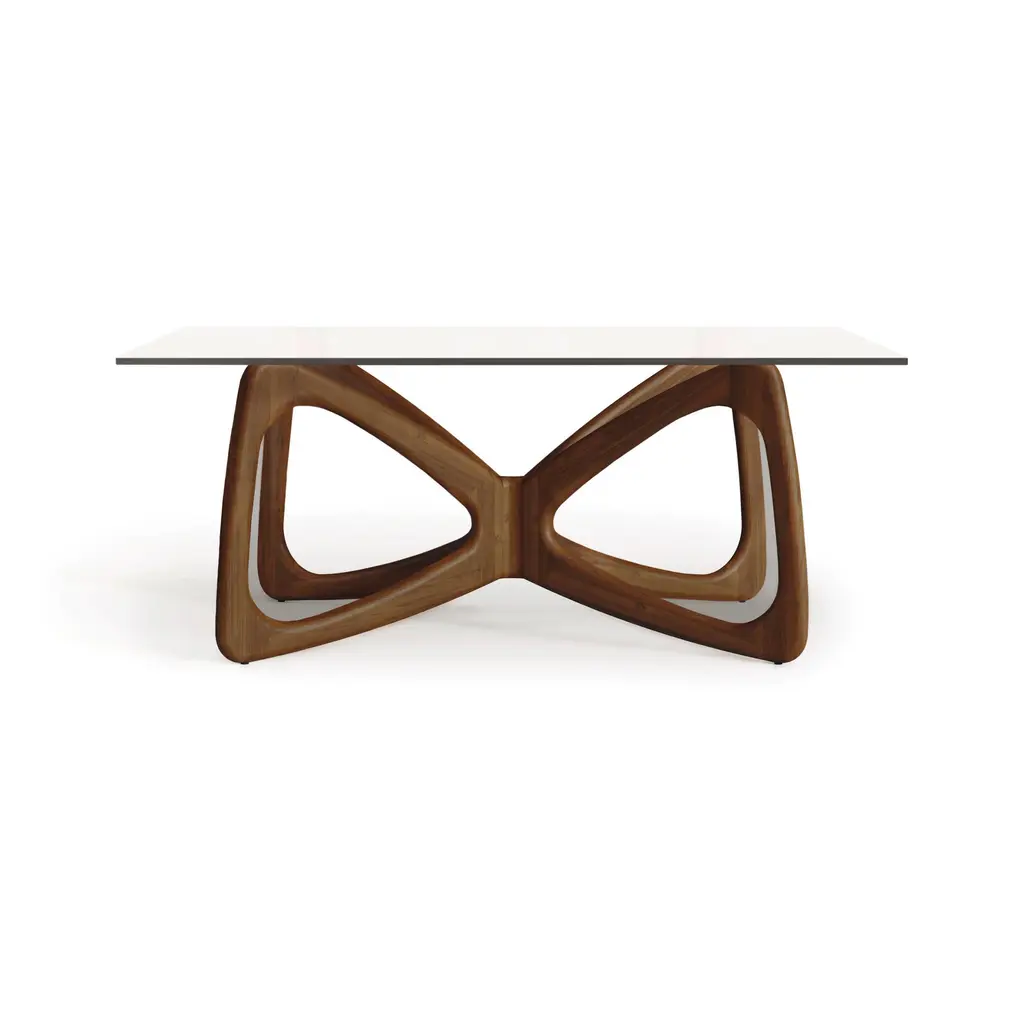 Create memorable meal times with the striking Butterfly Glass Top Dining Table from Copeland Furniture. Crafted with natural inspiration and modern aesthetics in mind, this table is crafted from solid American black walnut hardwood and solid Oak for durability. Perfect for everyday use or as a conversation piece at lively gatherings, the sculptural base of this table is elevated by the spacious glass tabletop for an eye-catching contrast. Highlights