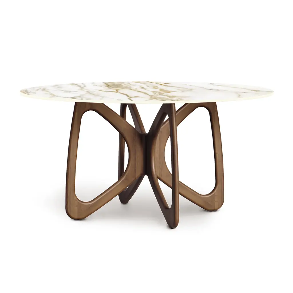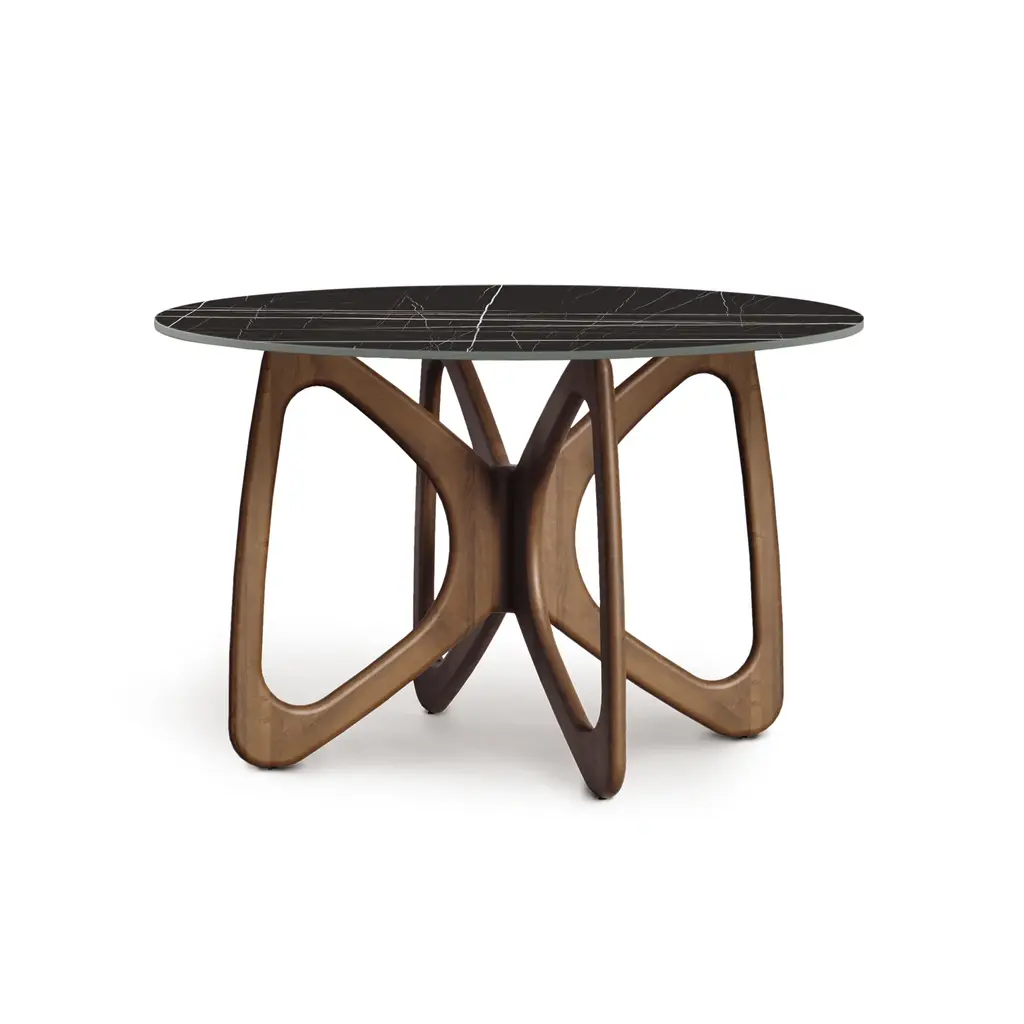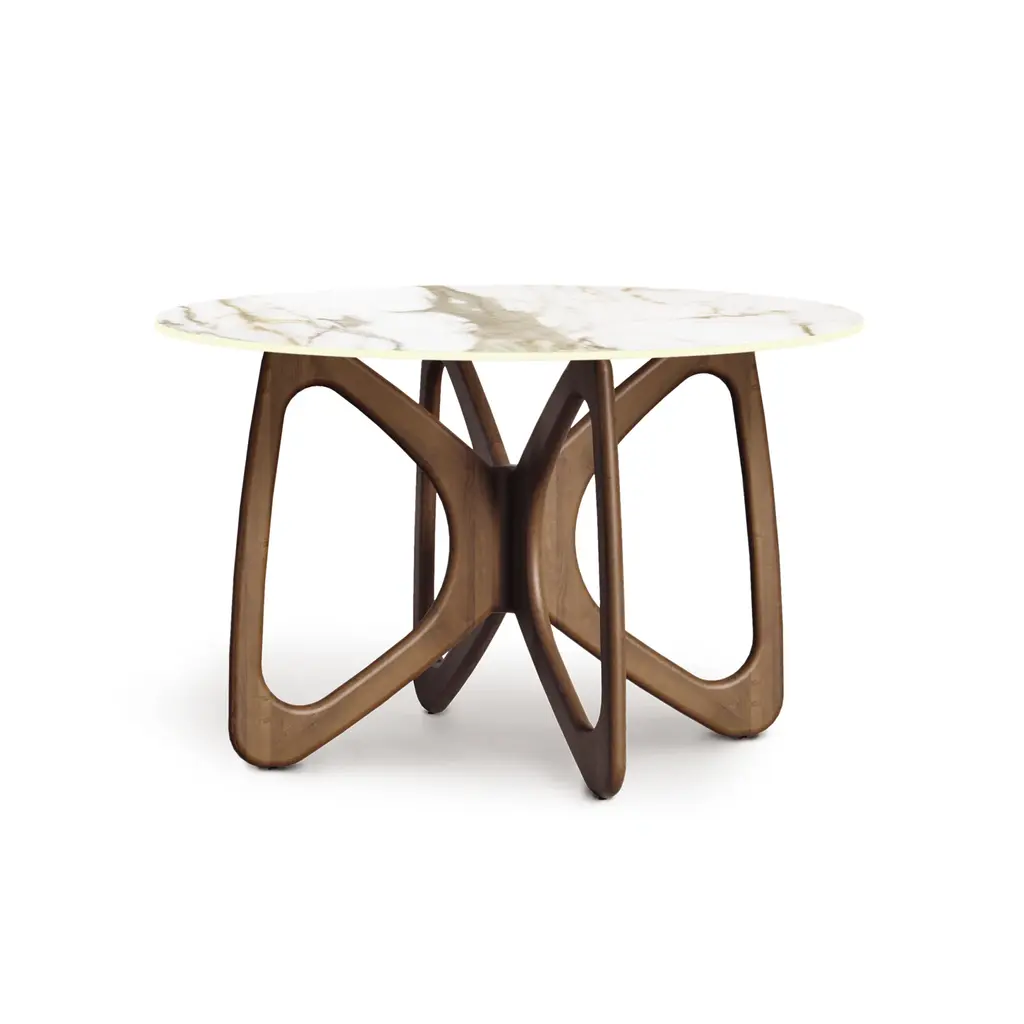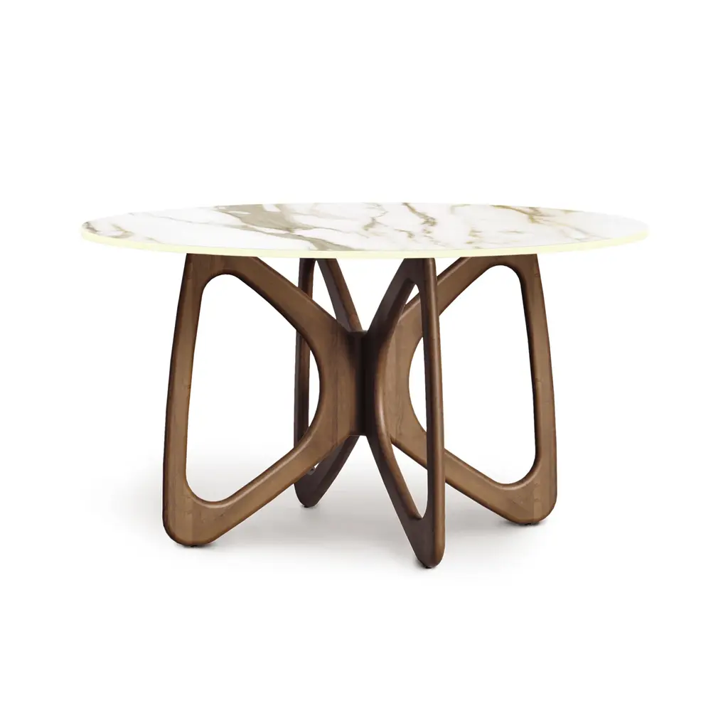 Our Butterfly Round Sintered Stone Top Dining Table by Copeland blends modern aesthetics with the beautiful intricacies of the natural world, like the unfurling wings of the elegant Monarch. Featuring soft rounded lines throughout, this innovative stone top table in made-to-order in sustainably sourced North American hardwoods with an ultra-durable eco-friendly stone top that offers a striking design to any modern dining space. Add this instant conversation starter to your home and enjoy the liveliness that it brings to all of your gatherings. Base price represents 48" round table in natural oakShown in 54" round table in natural walnut with sahara noir stone topMatching furniture available in our Butterfly Furniture Collection