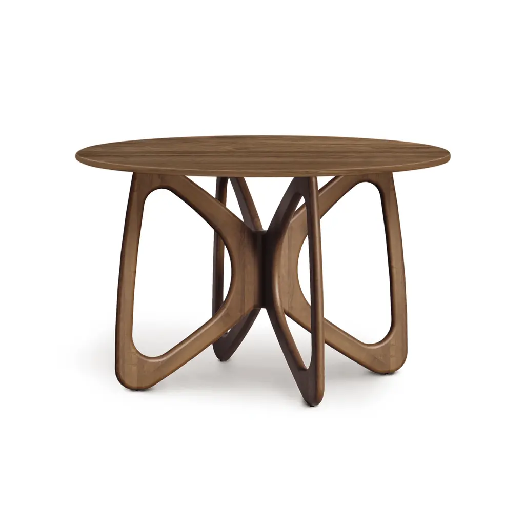 Our Butterfly Round Solid Top Dining Table by Copeland blends modern aesthetics with the beautiful intricacies of the natural world, like the unfurling wings of the elegant Monarch. Featuring soft rounded corners throughout, this solid wood top table is made-to-order in sustainably sourced North American hardwoods, that not only offer a striking design, but also offer unmatched durability. Add this instant conversation starter to your home and enjoy the liveliness that it brings to all of your gatherings. Base price represents 48" round table in natural oakShown in 54" round table in natural walnutMatching furniture available in our Butterfly Furniture Collection