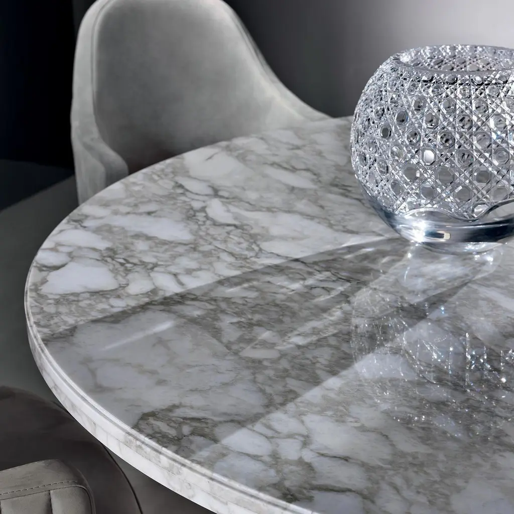 This sculptural table boasts two bold textures: the grosgrain design leather covering the pillar-shaped solid linden wood base and the Emperador marble top. The warm burnished brass round platform provides a luxurious detail reminiscent of the dark, rich browns and grays hues of the top creating a striking visual balance. A piece of refined elegance, this table can effortlessly go from the dining room to an office environment, as a stately conference table.