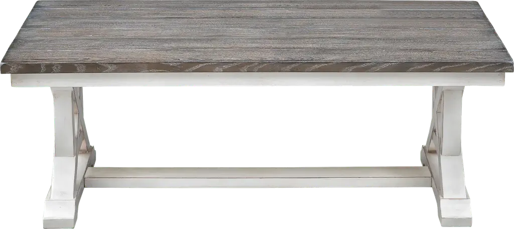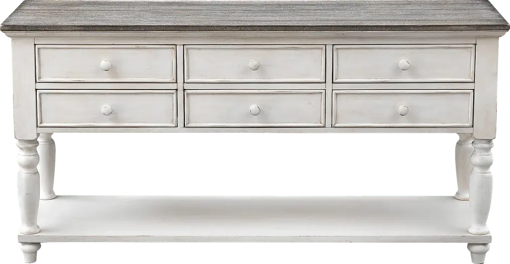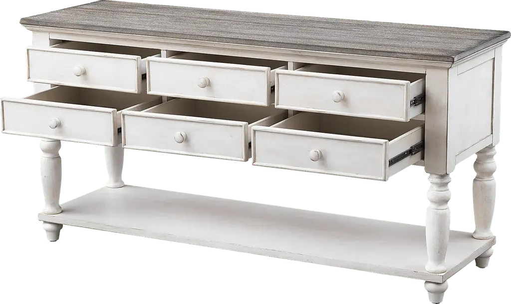 A plank style top with a natural aged patina sets off the paler cream finish that coats the six drawer Bywood console table, a lovely combination The six roomy drawers above provide ample storage space for everything from your table linens and serving pieces, to your pens and art supplies, while the full lower shelf below is perfect for baskets or books. With turned legs and feet, matching hardware and extended drawer glides, this beautiful Console is the perfect choice for your dining room, den or foyer. Customer assembly is required.