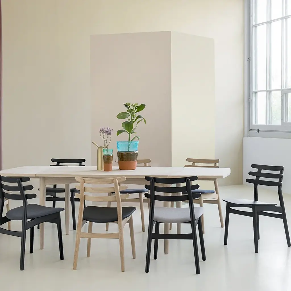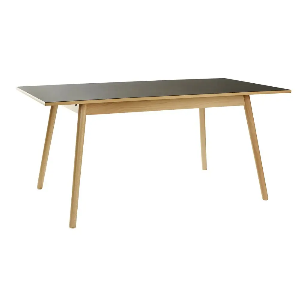 The table frame is made of solid wood - the table tops are either in solid laqcuered beech or black linoleum with beech edging. Solid wood is a 100% natural material, which gives natural variations between the planks and results in this table appearing completely individual - no two tables are alike. The individual planks in the table top are carefully selected and sorted so that color and veining harmonazi. In the individual piece of wood, there will naturally be color or texture variations, but the selection is made based on the desire to create a beautiful overall impression at a competatice price.