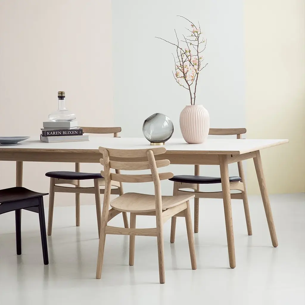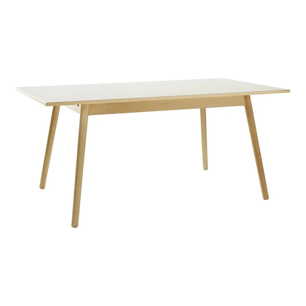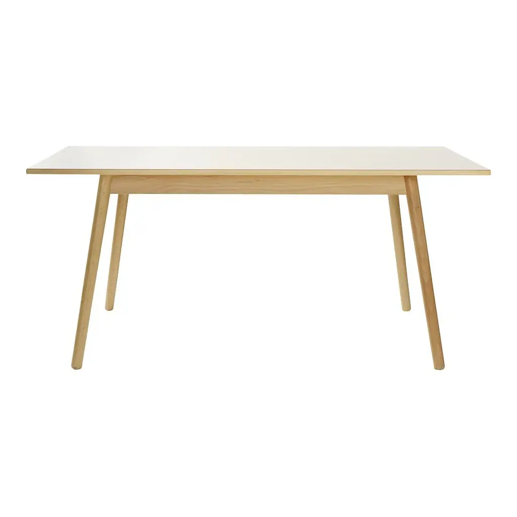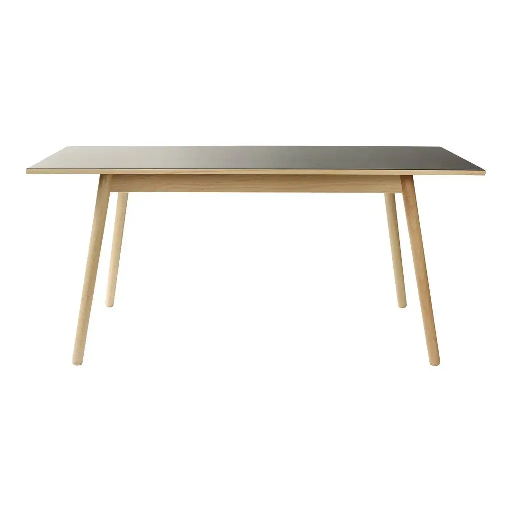 The table frame is made of solid wood - the table tops are either in solid laqcuered beech or black linoleum with beech edging. Solid wood is a 100% natural material, which gives natural variations between the planks and results in this table appearing completely individual - no two tables are alike. The individual planks in the table top are carefully selected and sorted so that color and veining harmonazi. In the individual piece of wood, there will naturally be color or texture variations, but the selection is made based on the desire to create a beautiful overall impression at a competatice price.