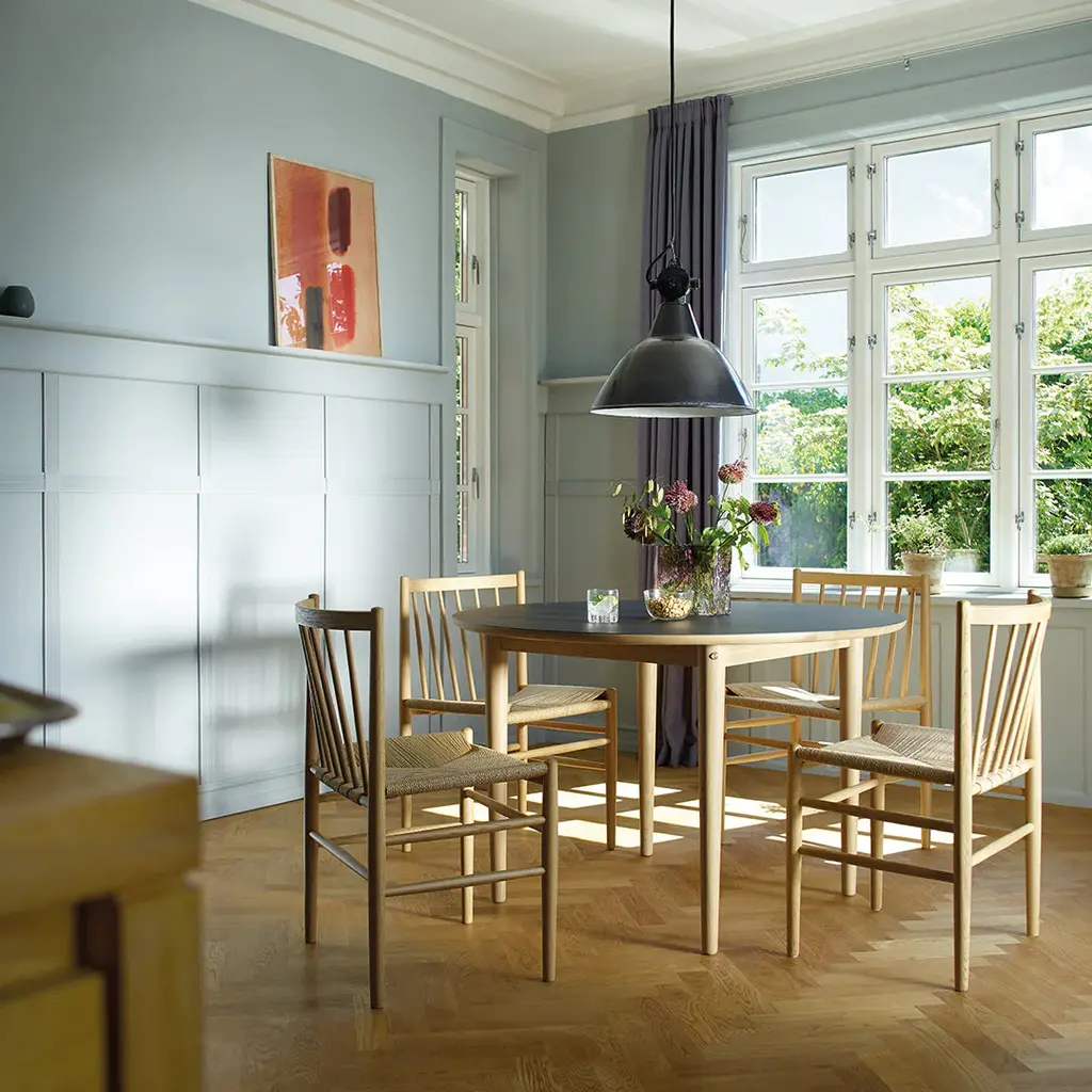 The dining table in the Bjork range is designed to strike a balance between tradition and innovation, a recurring theme throughout FDB Mobler's history. The Table suits both large dining rooms and small urban kitchens, and with the insert it can easily be extended to make room for four extra chairs. The rounded shape and bright oak create a bright, unique and contemporary look. At the same time, it's part of FDB Mobler's design heritage, and can equally well be matched with some of the classic chairs from the company's first golden age.