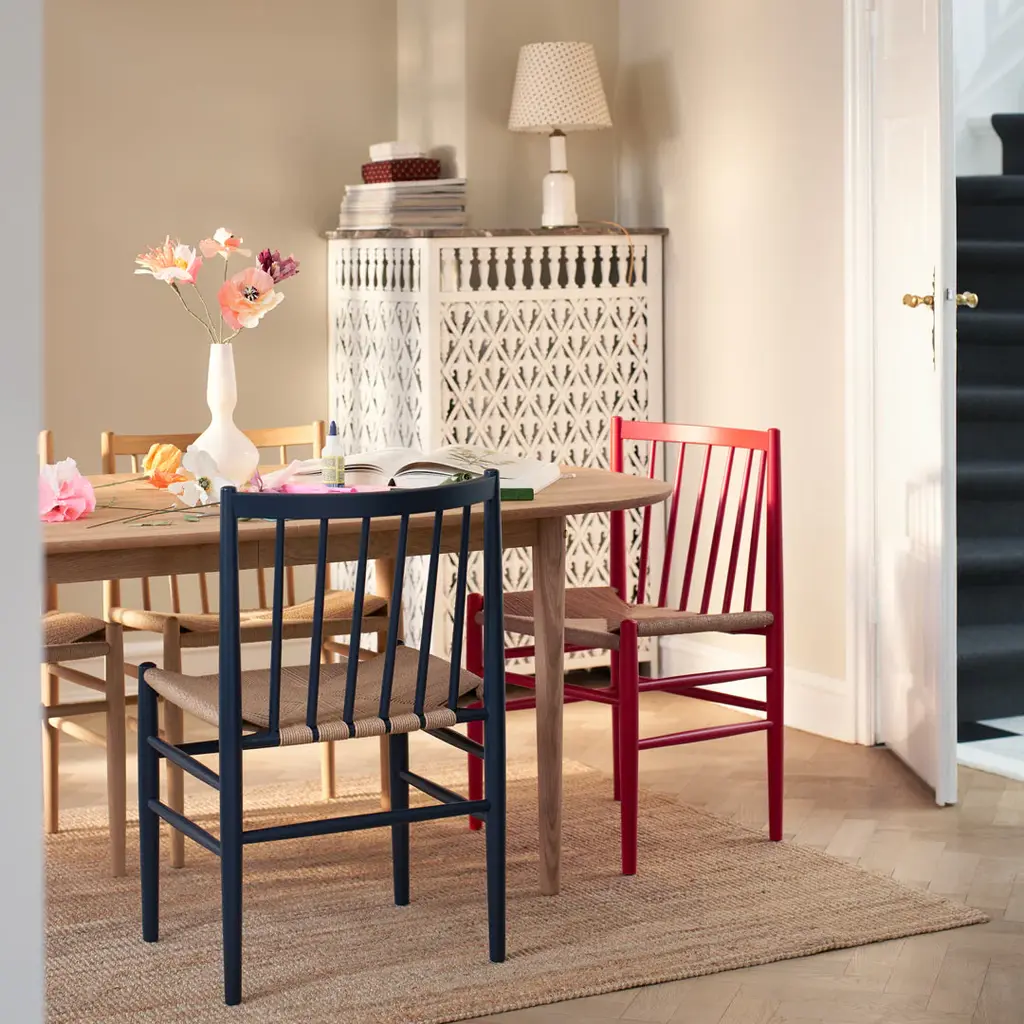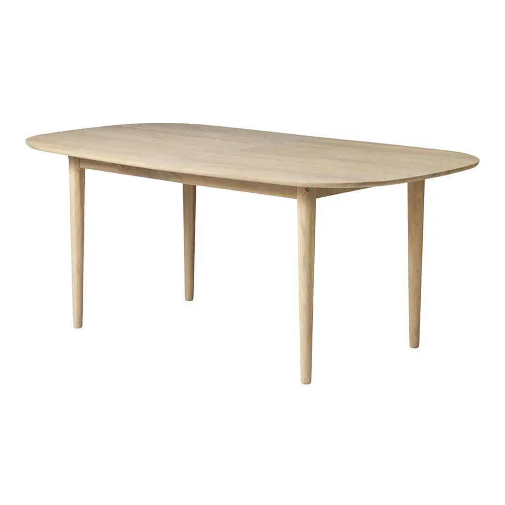 The dining table in the Bjork range is designed to strike a balance between tradition and innovation, a recurring theme throughout FDB Mobler's history. The Table suits both large dining rooms and small urban kitchens, and with the insert it can easily be extended to make room for four extra chairs. The rounded shape and bright oak create a bright, unique and contemporary look. At the same time, it's part of FDB Mobler's design heritage, and can equally well be matched with some of the classic chairs from the company's first golden age. The table is available in solid oak or with a linoleum top.