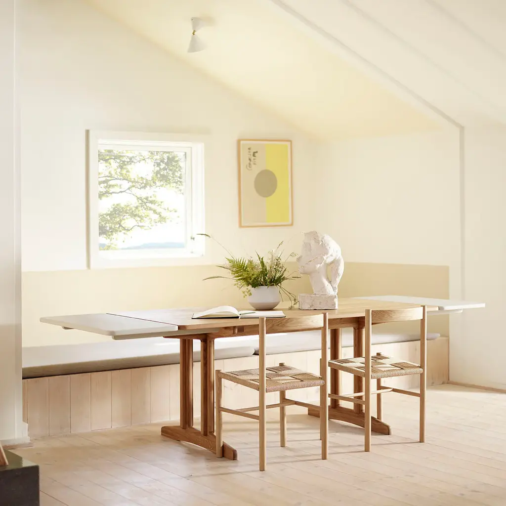 The C64 Shaker Dining Table represents Borge Mogensen's enduring fascination with Shaker design principles, originally conceived in 1950 but never produced due to its bold cross-shaped legs. Decades later, FDB Møbler finally brought this visionary piece to life, revealing its timeless appeal that transcends changing design trends. The elegant underframe, drawn beneath the tabletop, creates the illusion of a floating surface while providing generous legroom—a testament to Mogensen's masterful balance of aesthetic innovation and functional sophistication. Highlights