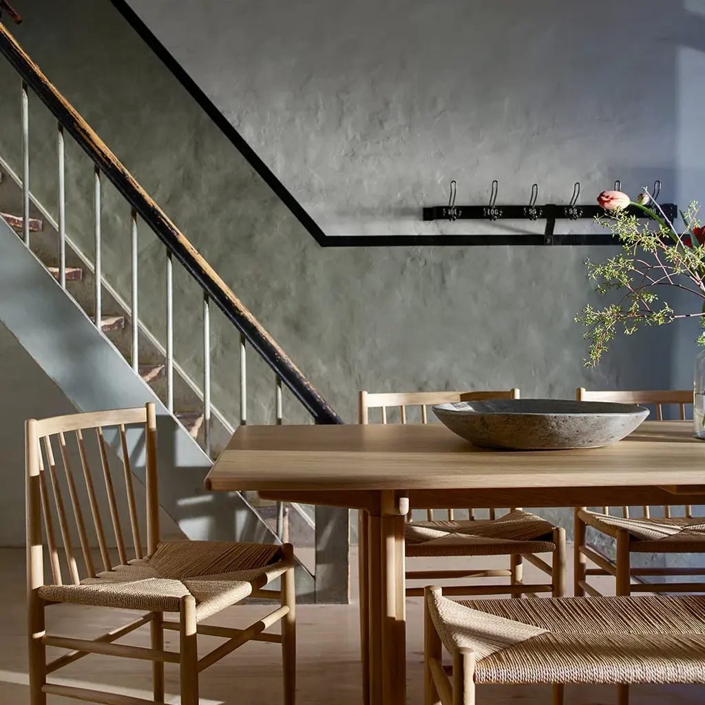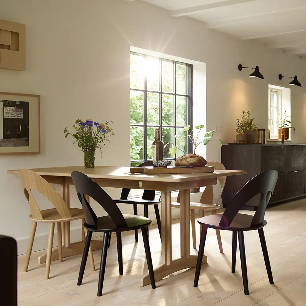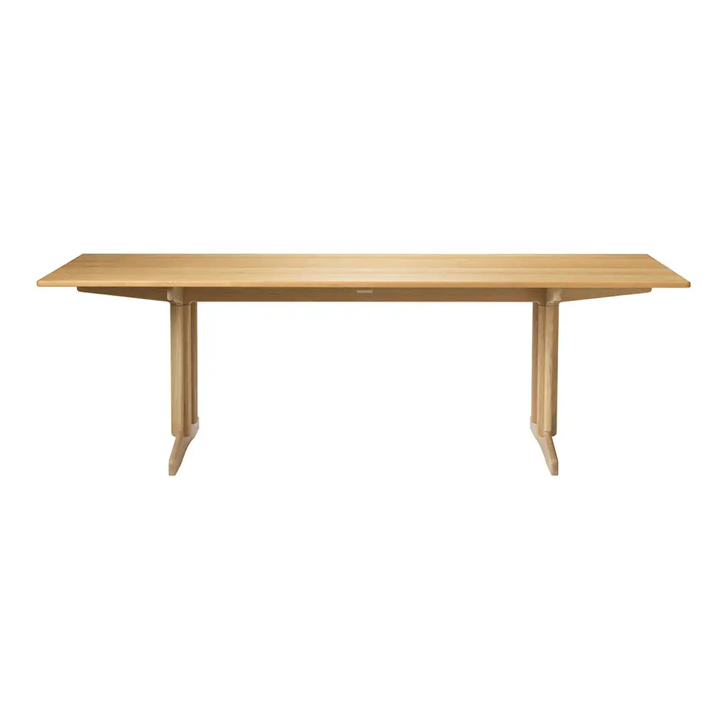 With its elegant and unique underframe, which is drawn in under the tabletop, the simple rectangular surface appears to float freely in space while allowing plenty of legroom. The table comes across as being highly functional with a practical tabletop with rounded edges, and builds on Borge Mogensen's unwavering requirement that a piece of furniture should serve its users and support human activities rather than forcing people to adapt to the furniture.