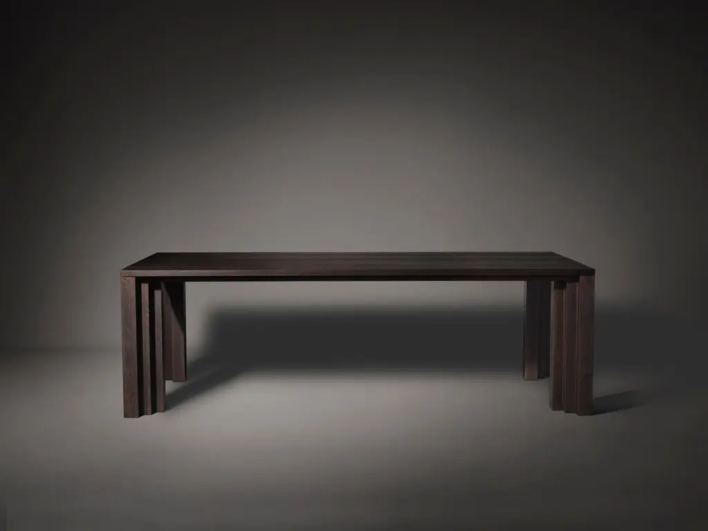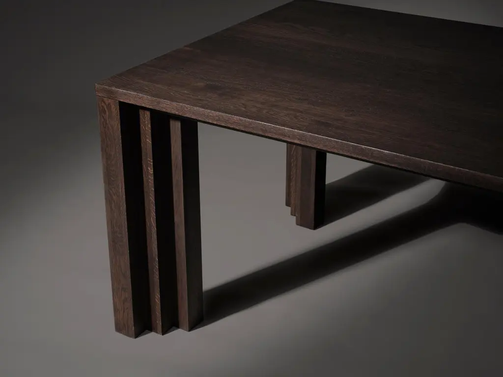 Cadence 240 Dining Room Table in Dark Brown European Oak by Mokko AmsterdamDimensions: D 90 x W 240 x H 75 cm. Materials: European oak.Available in different material options and dimensions. Designed by Aad Bos and crafted in the Netherlands. Please contact us.cadence tableThe Cadence table is inspired by the simplicity and power of the rhythmic stepped brickwork visible in the architecture of Amsterdam's 'South Plan' area; the city development plan designed by H.P. Berlage in 1915. A flow of rhythmic volumes and shade lines. The repetitive forms deepen the meaning of the home's altar that is the table. A matching Cadence table bench is available.Designed by Aad Bos and crafted in the Netherlands out of solid European oak or American walnut. The product is made to order with a production time of 7-8 weeks and customizable in design, size, material and color. We welcome you to our studio to get a feel for the quality and presence of our objects.Mokko represents a collection of interior objects designed by founder Aad Bos. The Amsterdam-based studio was established in 2017 and creates custom products for interior professionals and design enthusiasts internationally.Objects by Mokko feature a rhythm of monolithic form, created through an iteration of volumes and voids. Architectural elements are balanced, weighed and stripped from excess, until the essence of the inspiration is translated into a sculptural object that is emotionally resonant.With respect for nature and robust furniture building, each piece is made in close collaboration with local carpenters in the Netherlands from high-quality, sustainable materials. All objects are custom-made and conceived as future heirlooms; intended to be valued, used and passed down through generations.