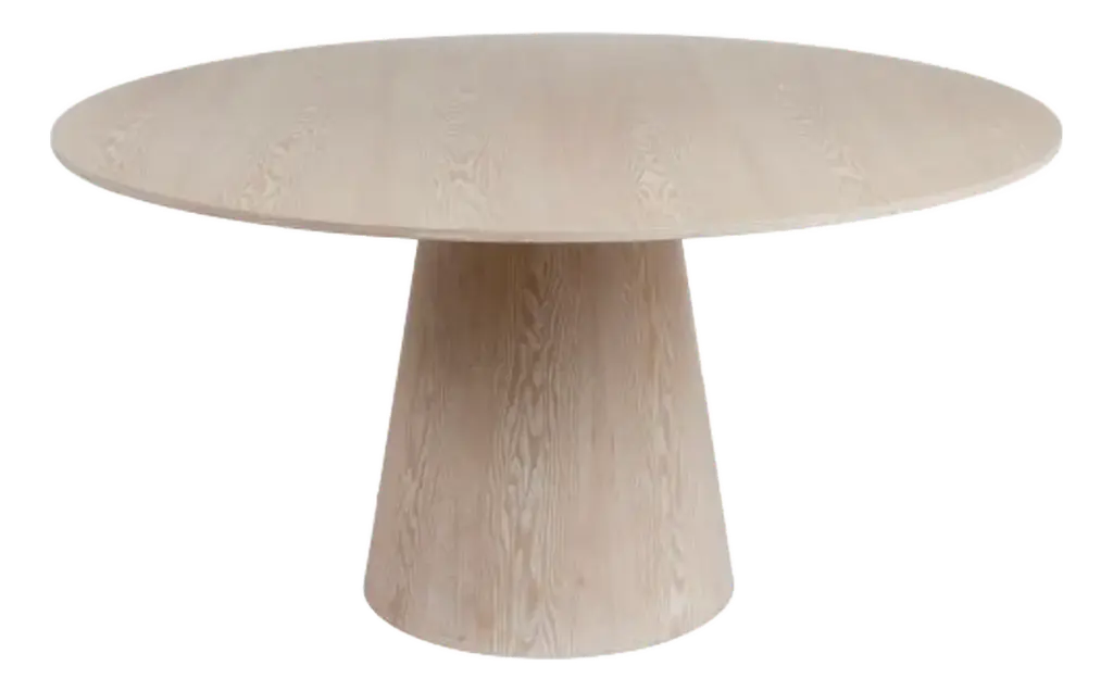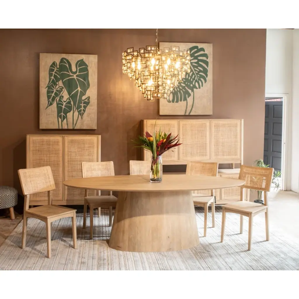 A study in shape. Solid black acacia forms crescent legs and a sprawling oval-shaped tabletop, bringing an organic presence to the dining room. Seats 8–10 people.