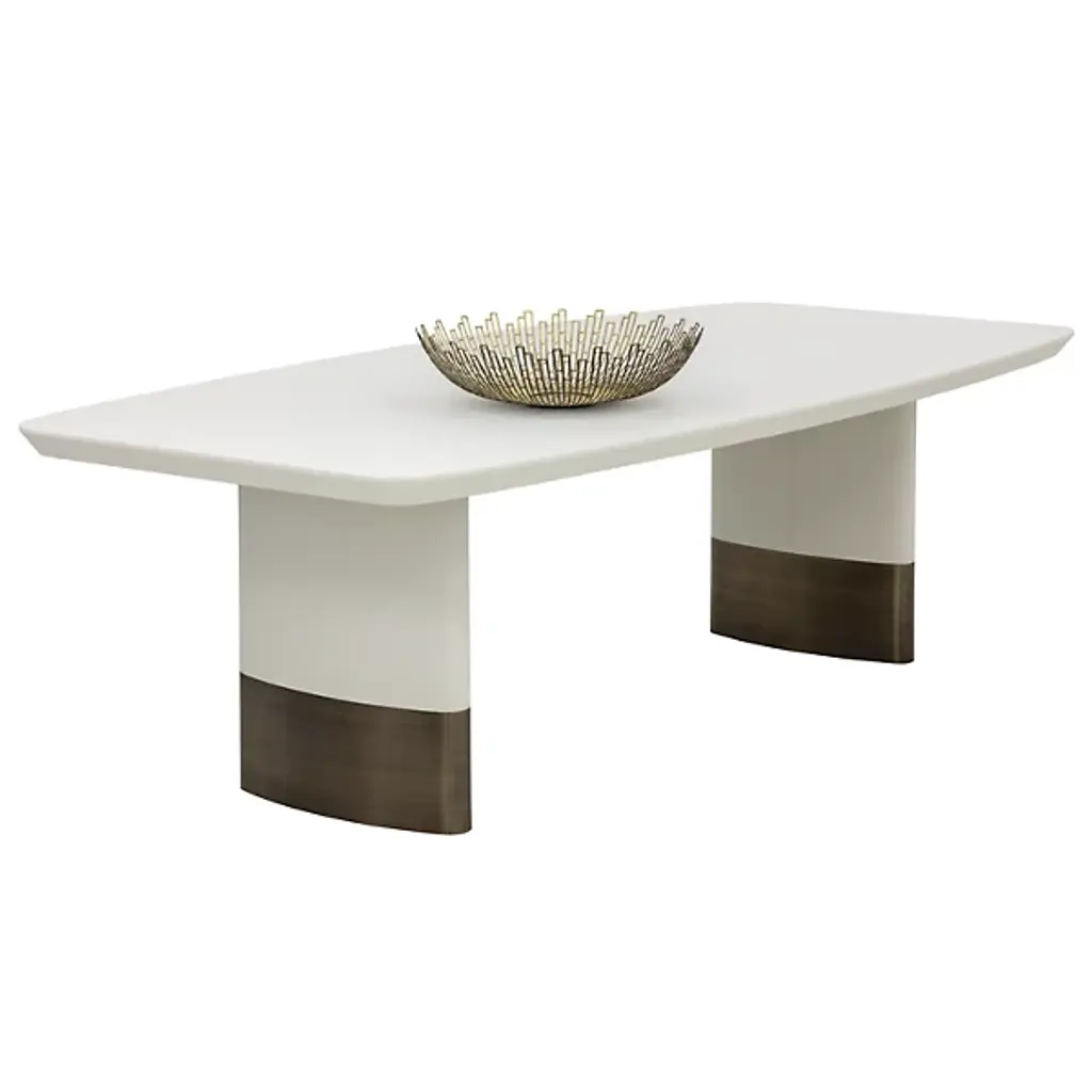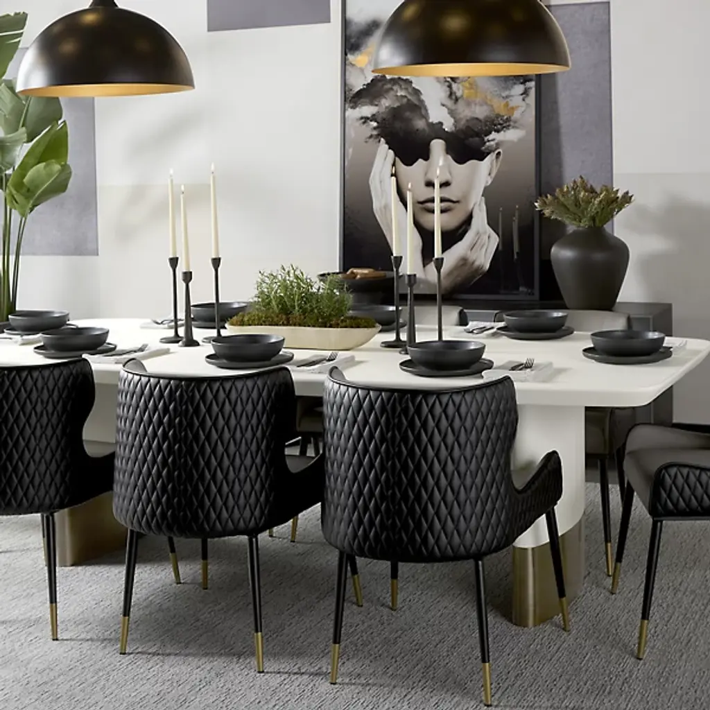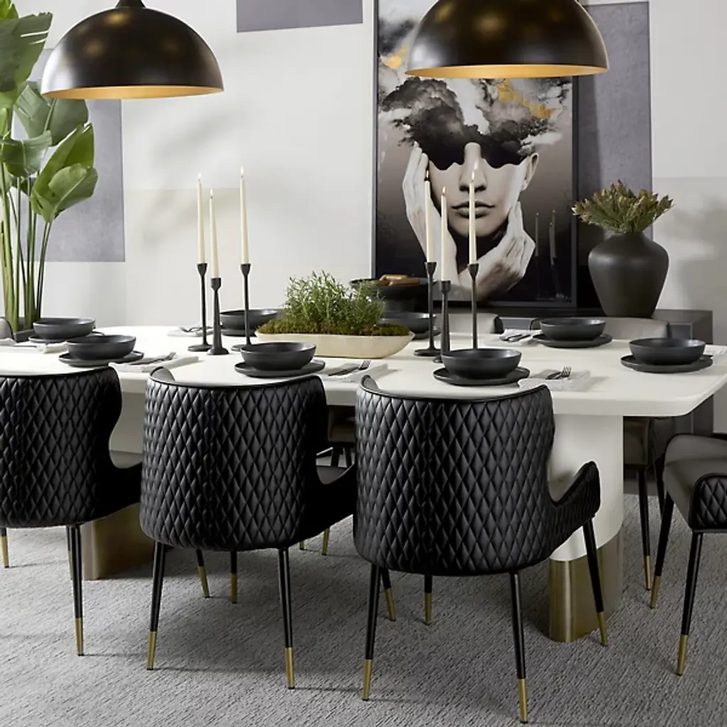 The Calida Dining Table from Sunpan offers style and functionality, bringing any dining space to life with its beautifully textured design. Generously sized, it is fully upholstered in pebbled cream faux leather, which is scratch-resistant and easy to clean. The look is elegantly finished with a brushed gold stainless steel base. Crafted to mimic the natural characteristics of leather, the faux leather showcases unique color variations, markings, wrinkles, and light scratches that add to its sophisticated appeal.