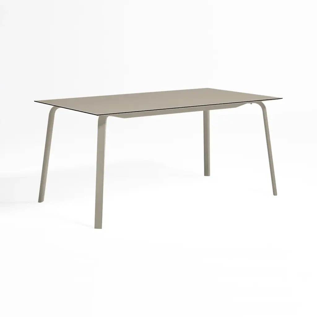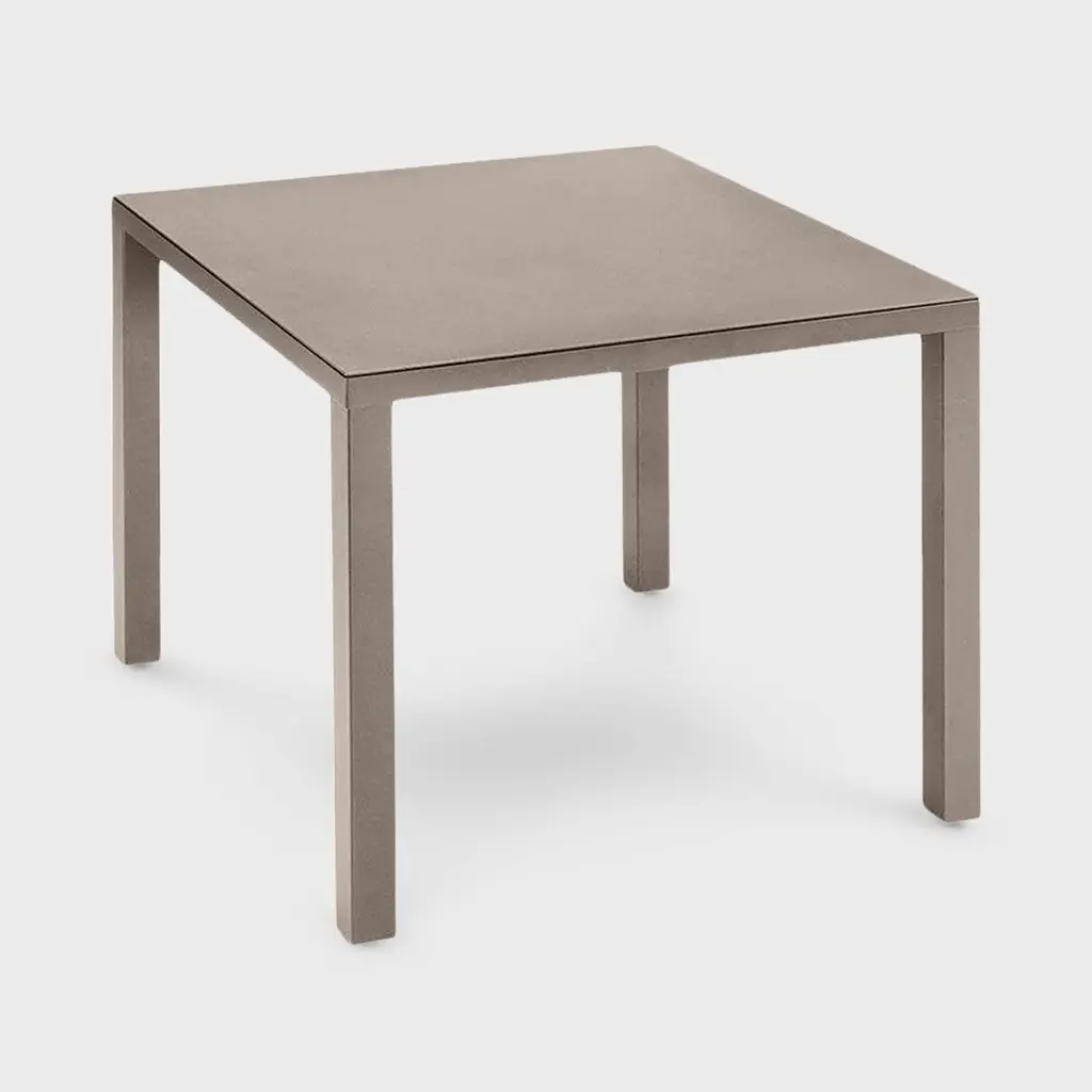 A contemporary piece suitable for use indoors or out. Designed by Antoine Lesur, the Calvi Square Dining Table by Fermob is made entirely of lightweight and hard-wearing aluminum, with a sharp square top that appears to almost float above the angular frame. A polyester powder coat makes the table even more resistant to inclement weather, as well as an eye-catching centerpiece in a dining area. Adjustable foot pads are included to keep the table level on uneven surfaces.