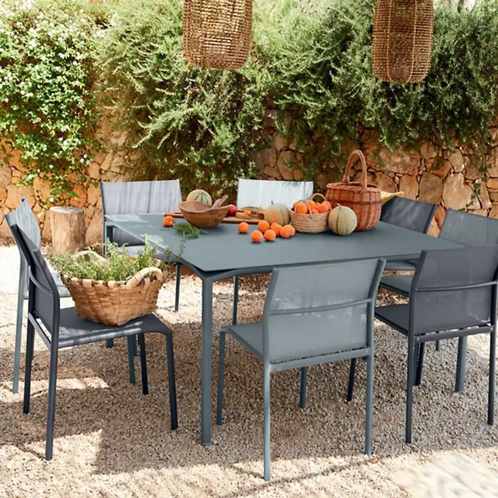 A contemporary piece suitable for use indoors or out. Designed by Antoine Lesur, the Calvi Square Dining Table by Fermob is made entirely of lightweight and hard-wearing aluminum, with a sharp square top that appears to almost float above the angular frame. A polyester powder coat makes the table even more resistant to inclement weather, as well as an eye-catching centerpiece in a dining area. Adjustable foot pads are included to keep the table level on uneven surfaces.