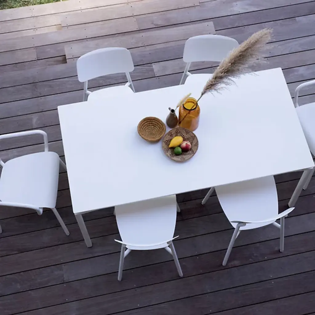 Embrace the alfresco lifestyle. The distinctive Calvi Table by Fermob is the perfect anchor to outdoor dining spaces. Showcasing a unique, lively design with modern lines and open, cut-out corners, the table brings a light, airy appearance to indoor and outdoor settings. Crafted from a lightweight mix of Aluminum sheeting and tubing, with a UV resistant, weather-resistant powder coating, this table withstands all weather conditions and will play host to all kinds of gatherings as well as day-to-day living. The rectangular shape and generous dimensions allows for end seating for 2, with space for large gatherings of up to 12 guests. For lasting laid-back elegance and comfort, harmonize your outdoor dining spaces with the Cadiz Chair.
