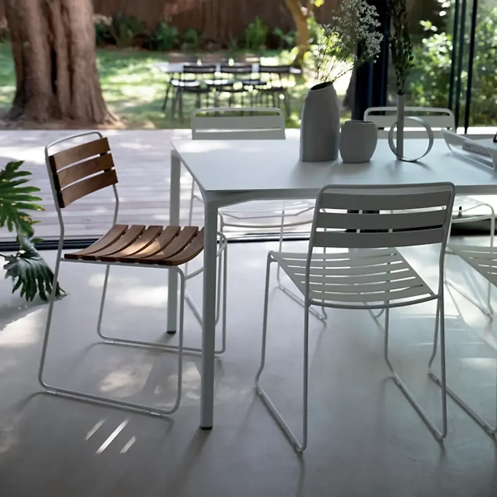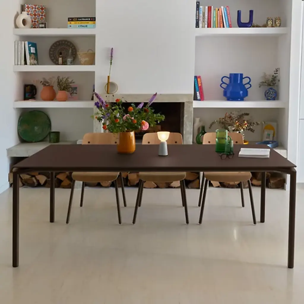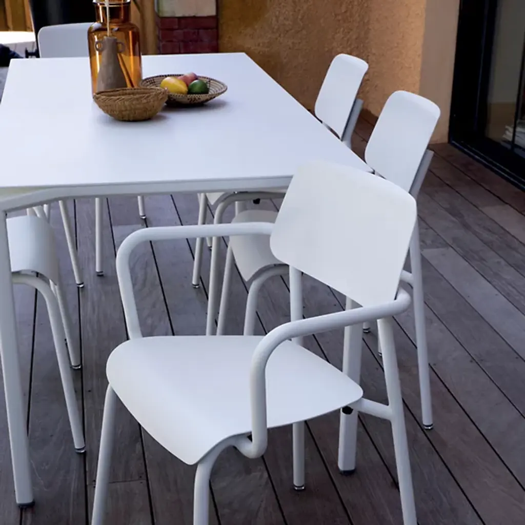 Embrace the alfresco lifestyle. The distinctive Calvi Table by Fermob is the perfect anchor to outdoor dining spaces. Showcasing a unique, lively design with modern lines and open, cut-out corners, the table brings a light, airy appearance to indoor and outdoor settings. Crafted from a lightweight mix of Aluminum sheeting and tubing, with a UV resistant, weather-resistant powder coating, this table withstands all weather conditions and will play host to all kinds of gatherings as well as day-to-day living. The rectangular shape and generous dimensions allows for end seating for 2, with space for large gatherings of up to 12 guests. For lasting laid-back elegance and comfort, harmonize your outdoor dining spaces with the Cadiz Chair.