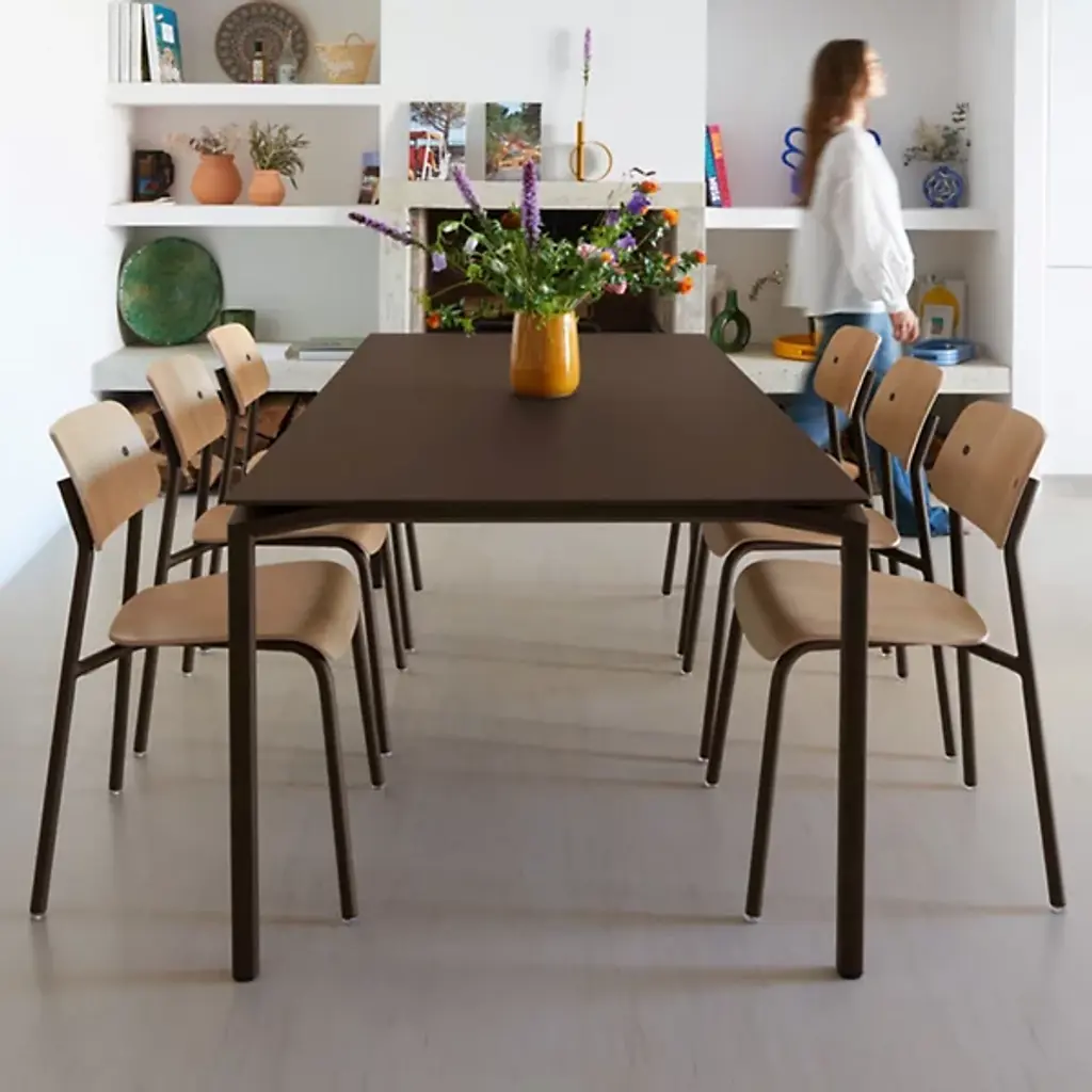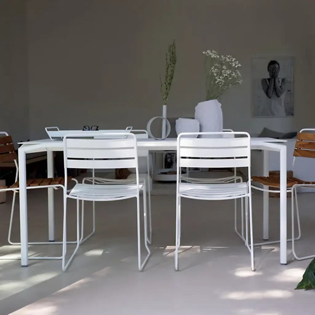 Embrace the alfresco lifestyle. The distinctive Calvi Table by Fermob is the perfect anchor to outdoor dining spaces. Showcasing a unique, lively design with modern lines and open, cut-out corners, the table brings a light, airy appearance to indoor and outdoor settings. Crafted from a lightweight mix of Aluminum sheeting and tubing, with a UV resistant, weather-resistant powder coating, this table withstands all weather conditions and will play host to all kinds of gatherings as well as day-to-day living. The rectangular shape and generous dimensions allows for end seating for 2, with space for large gatherings of up to 12 guests. For lasting laid-back elegance and comfort, harmonize your outdoor dining spaces with the Cadiz Chair.
