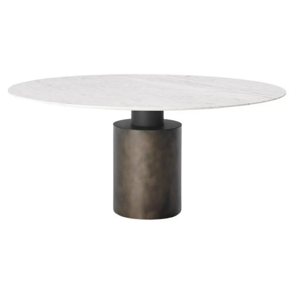 A circular tabletop with a marble inlay and rounded corners sits on a lacquered single-piece wooden leg covered with two metal inlays. The result is an edge-free table with fluid contours. The lower side of the base is Canaletto walnut, while the upper side is in matt lacquered pearl. The top frame is in matt lacquered pearl while the central top is in marble cat. 1 Sahara noir matt.
