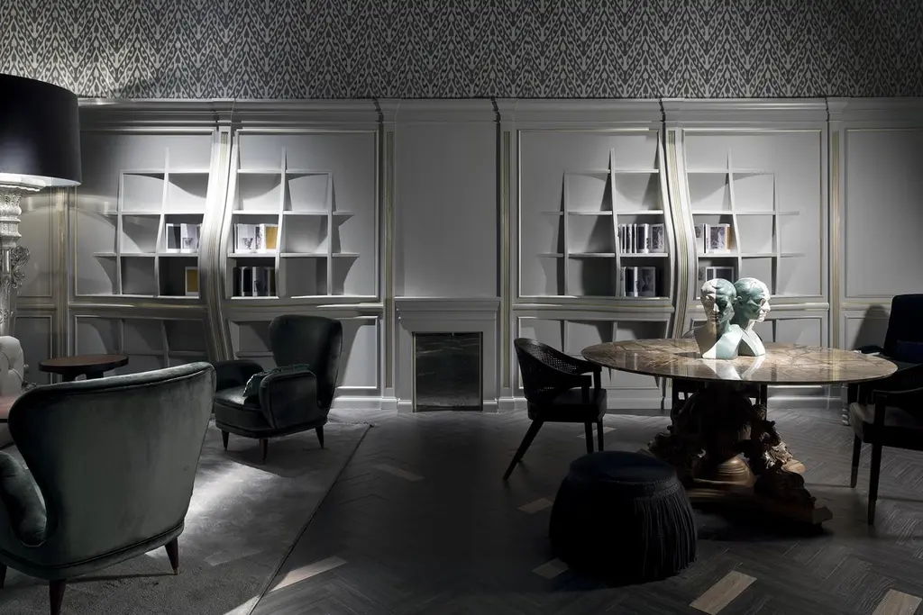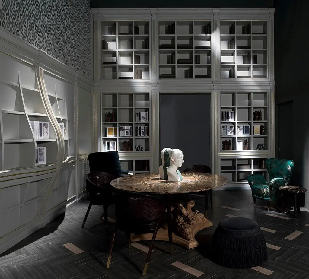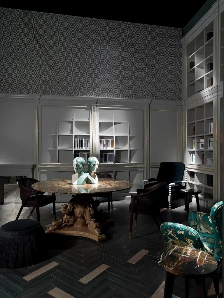 Introducing the Capital dining table—a masterpiece that transcends the ordinary, defined by a wooden inlaid base adorned with mythological figures of tritons and neoclassical motifs inspired by Greco-Roman aesthetics. This dining table is not just a piece of furniture; it's a symphony of artistry and opulence that captures the essence of refined luxury.The meticulously crafted wooden base of the Capital dining table tells a story of myth and classical inspiration, with tritons and neoclassical inlays adding an air of grandeur. The round surface, fashioned from rain forest brown marble, complements the rich character of the walnut base, creating a harmonious fusion of materials that exudes sophistication.Capital is more than a dining table; it's a statement piece dedicated to the most luxurious and refined styles. Whether placed in a grand dining room or a chic entertaining space, this table invites you to indulge in the pleasure of fine dining surrounded by timeless elegance. Elevate your home with the Capital dining table—a project that brings the allure of classical artistry to the heart of your living space.