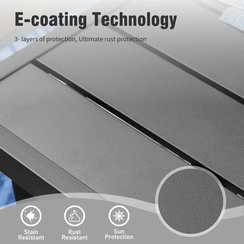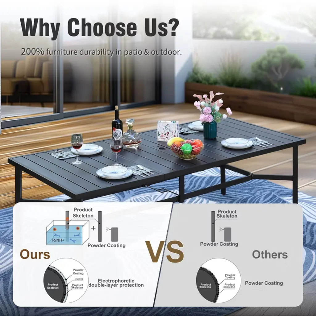 Enhance your outdoor dining with our Outdoor Patio Dining Table, which combines durability and style with its spacious rectangular surface and sturdy black metal construction. Crafted with a robust steel frame, this table offers excellent stability and weather resistance, making it ideal for outdoor use. Its generous size accommodates multiple guests comfortably, perfect for family meals or entertaining friends. Designed for longevity and ease of maintenance, this table enhances any patio setting with a sleek, modern aesthetic.