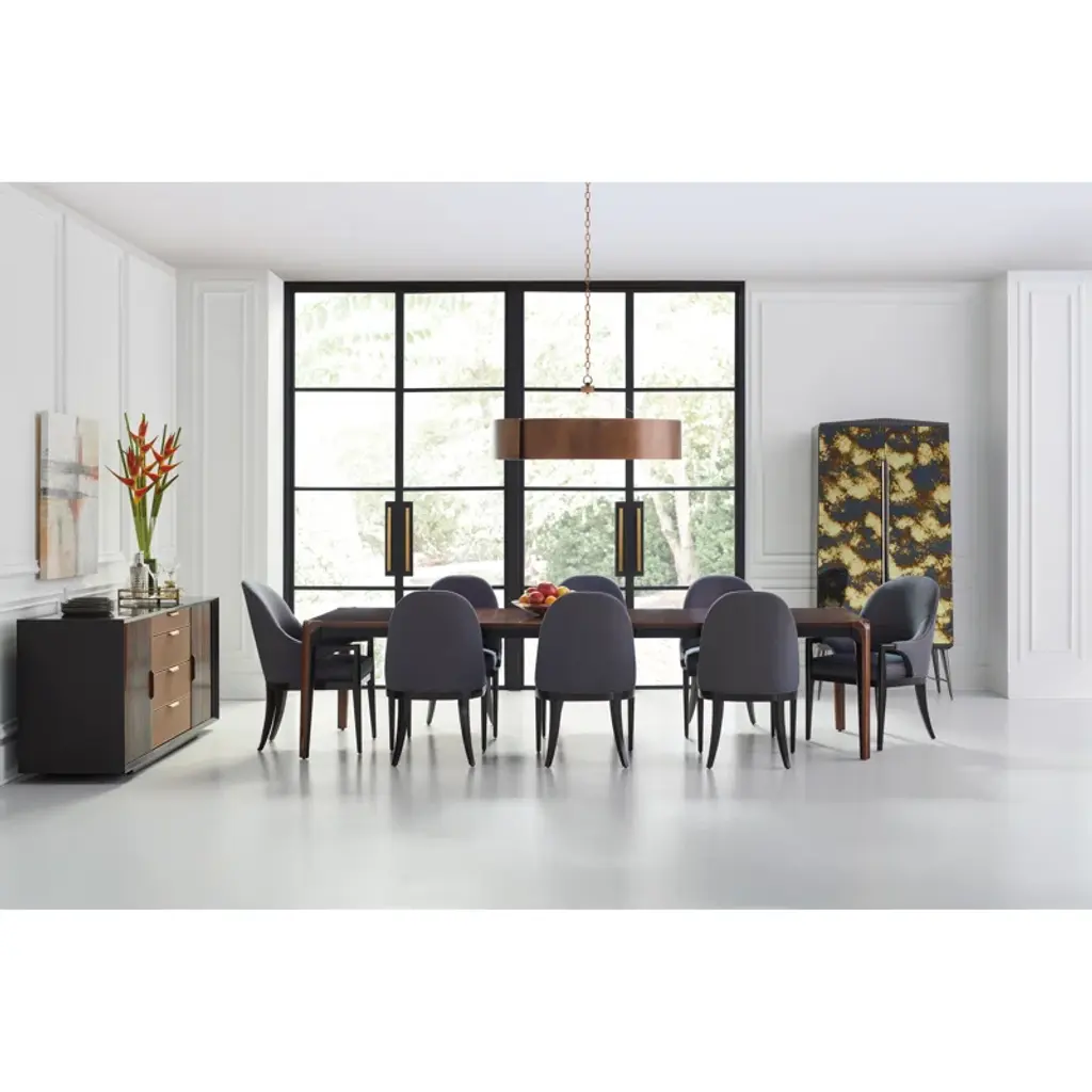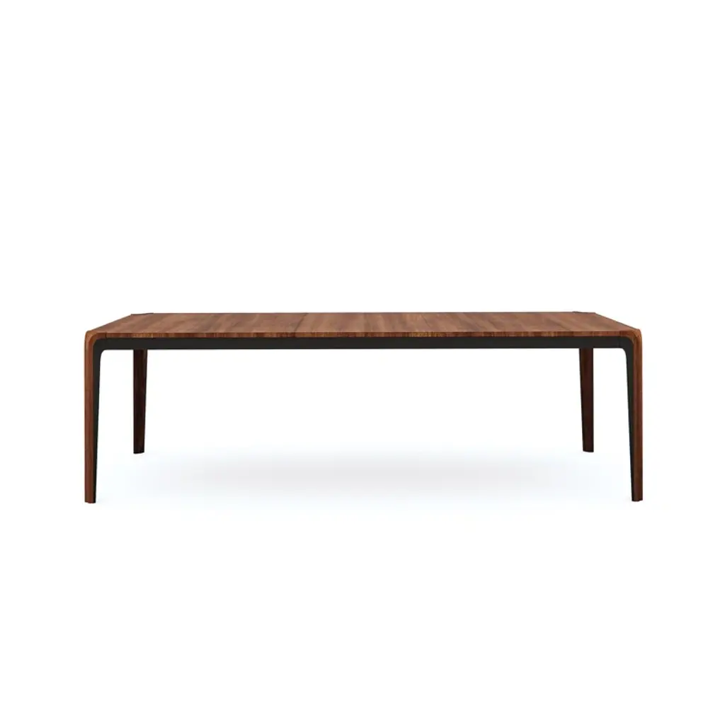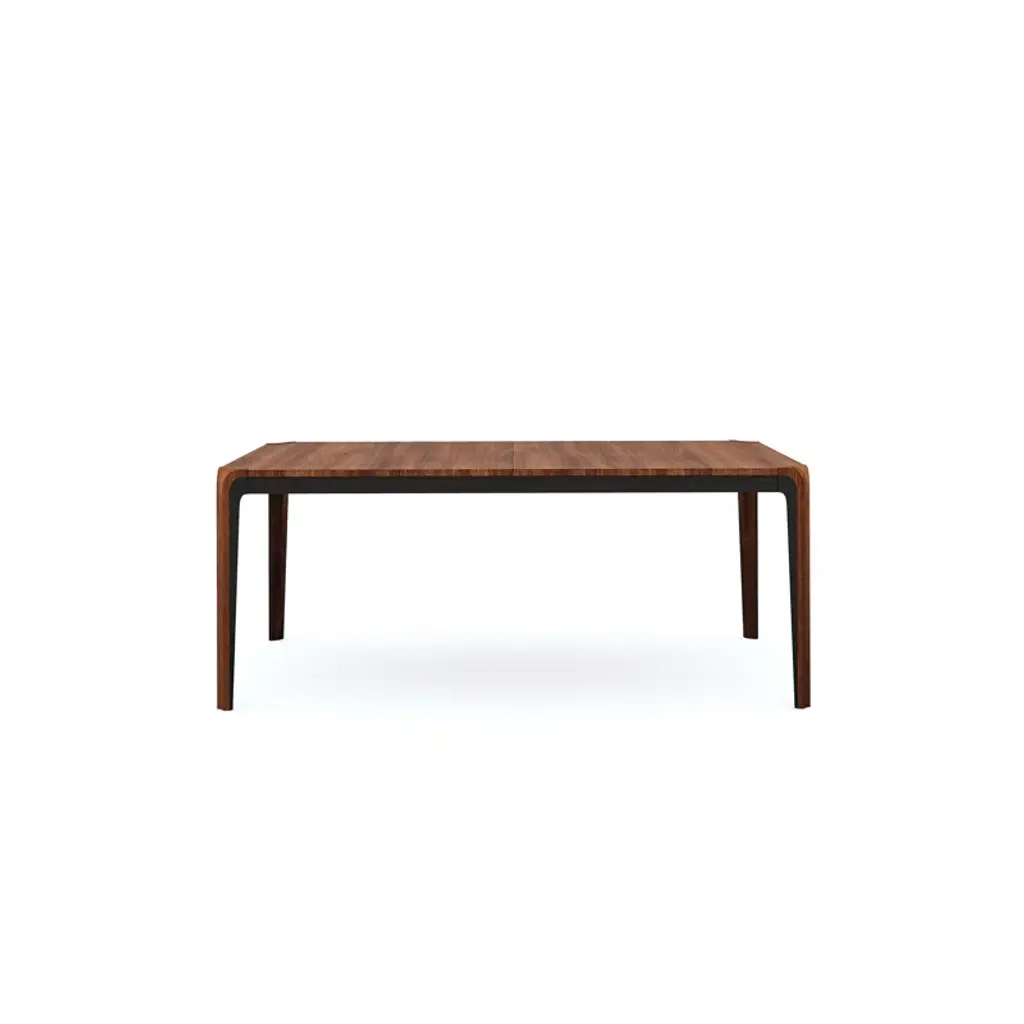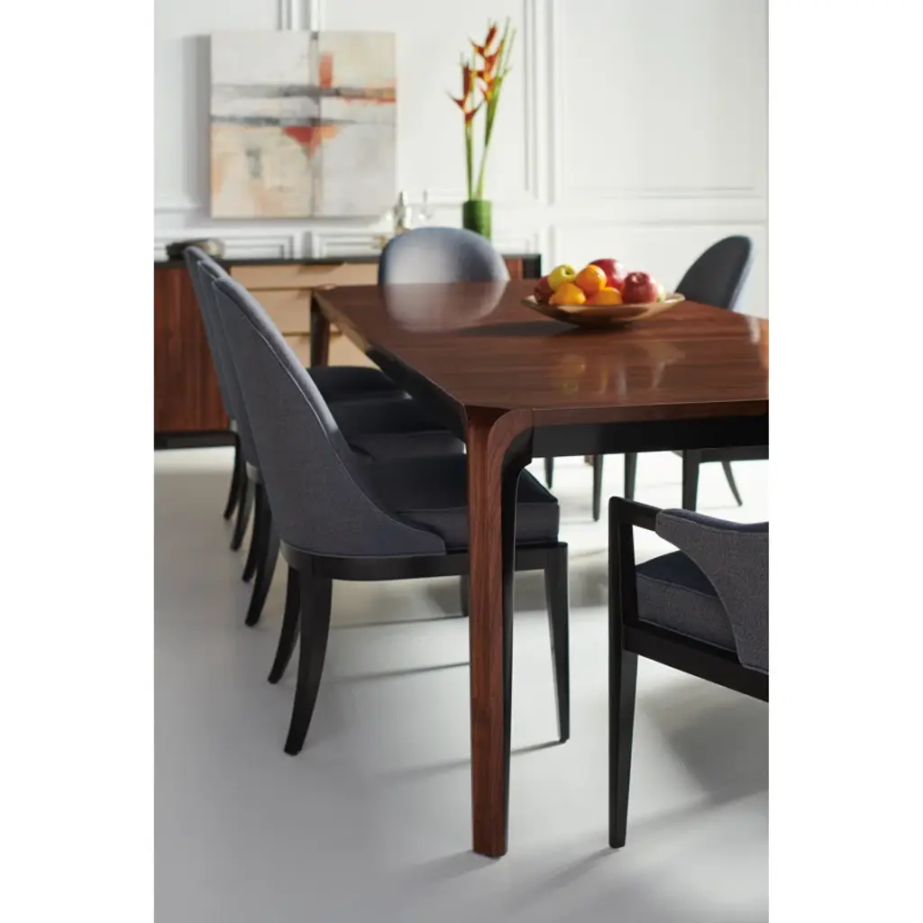 There’s always room for more with this extension dining table, evoking a balance between refined simplicity and modern functionality. Highlighting the intricate wood grain, the tabletop is finished in Rich Walnut with mitered edges in Dark Chocolate. Tapered legs, also trimmed in Dark Chocolate, appear to flow from the tabletop like a waterfall. Comfortably seats 8 without leaves, and seats 14 when fully expanded with three leaves.
