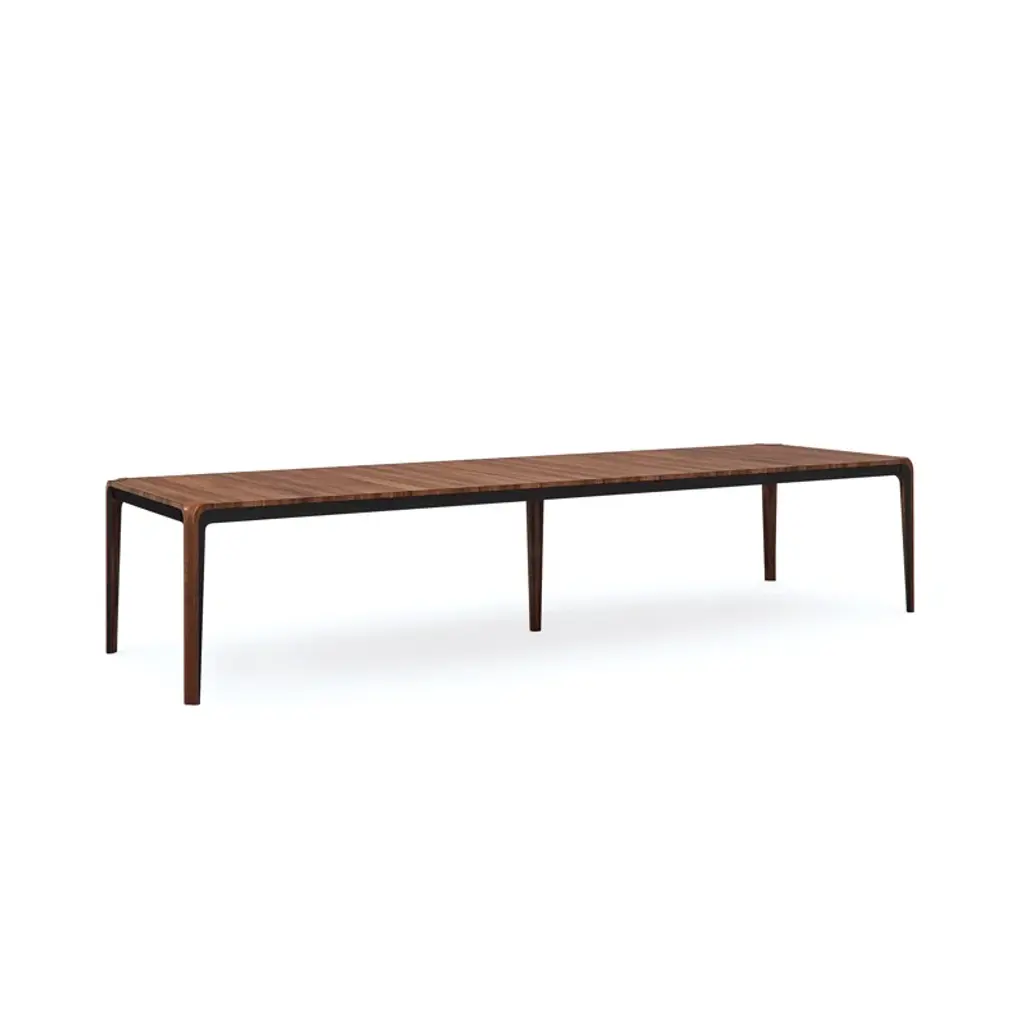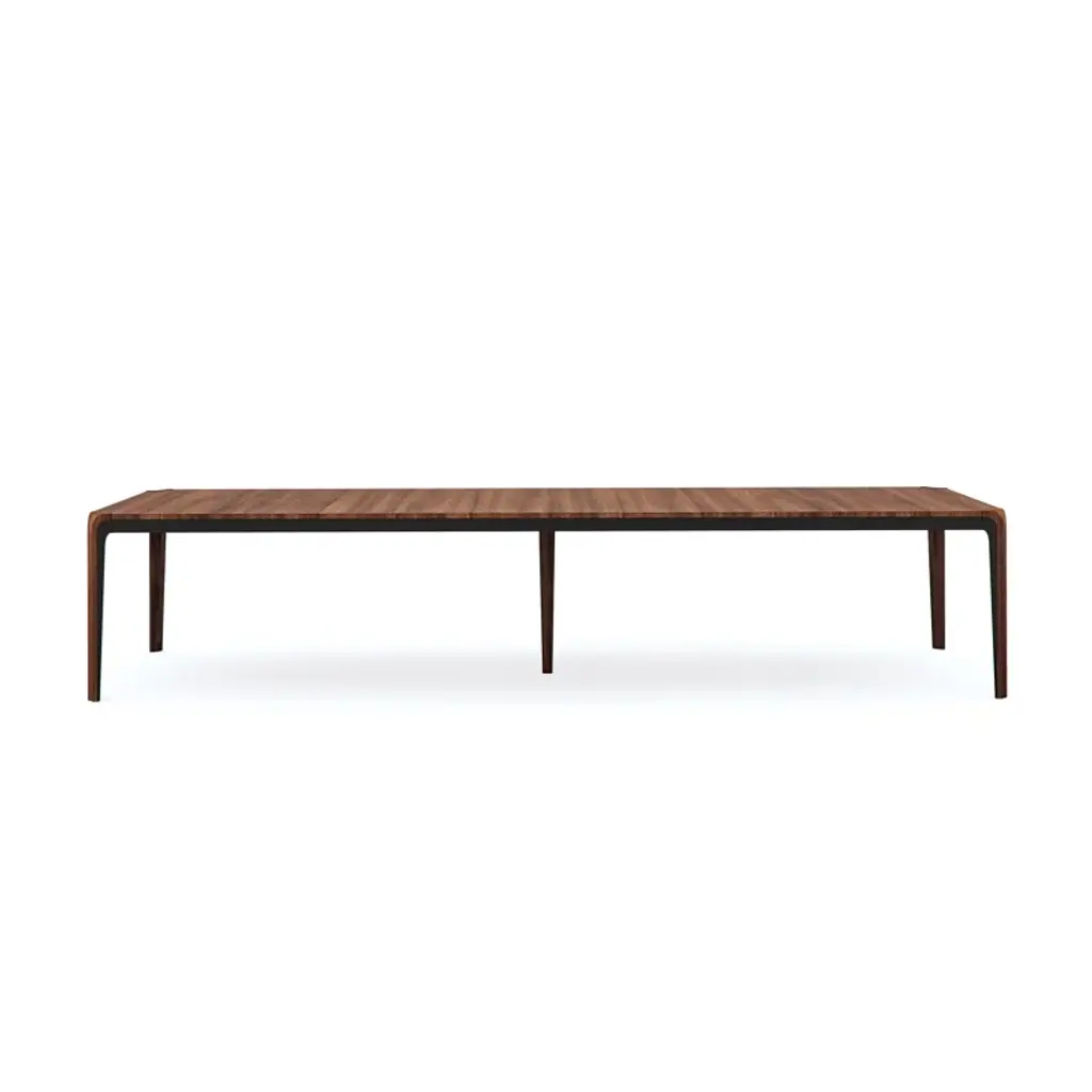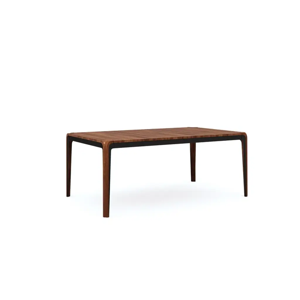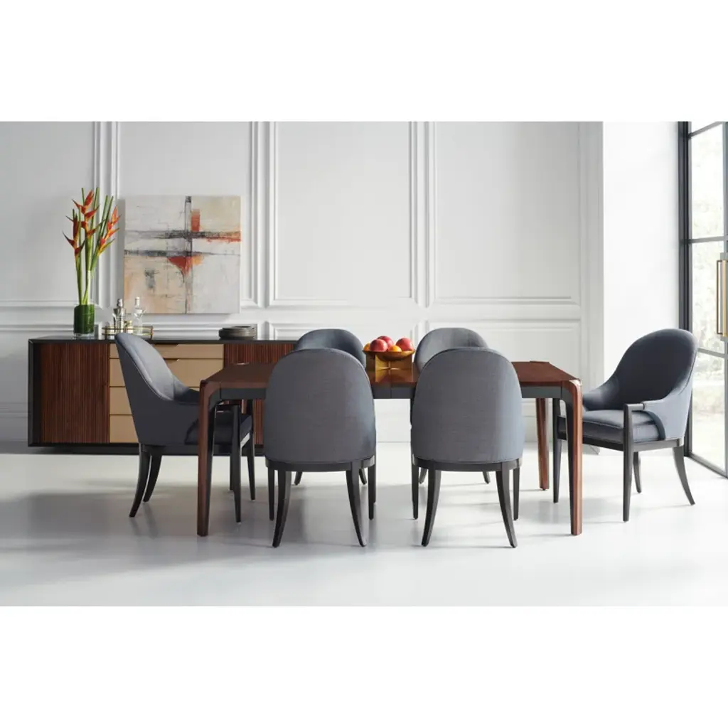 There’s always room for more with this extension dining table, evoking a balance between refined simplicity and modern functionality. Highlighting the intricate wood grain, the tabletop is finished in Rich Walnut with mitered edges in Dark Chocolate. Tapered legs, also trimmed in Dark Chocolate, appear to flow from the tabletop like a waterfall. Comfortably seats 8 without leaves, and seats 14 when fully expanded with three leaves.