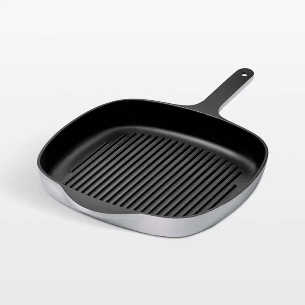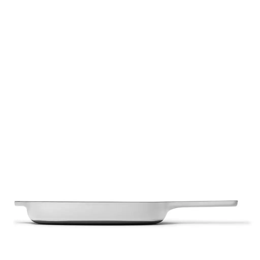 Caraway's charming minimalist style updates classic cast iron cookware for the modern kitchen. Three layers of black porcelain enamel coat the interior of this hand-finished grill pan, giving it a scratch-resistant, non-stick finish. Raised ridges sear foods with restaurant-worthy grill lines while allowing fats to drain away. Triple-glazed creamy grey on the exterior, the grill pan has a fresh, understated look on the stove, pot rack or dining table.