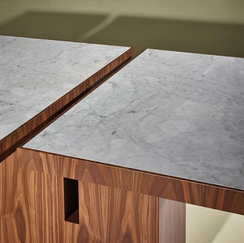 Dining table with tops in Carrara marble.Bespoke / customizableIdentical shapes with different sizes and finishings.All RAL colors available. (Mate / half gloss / gloss).