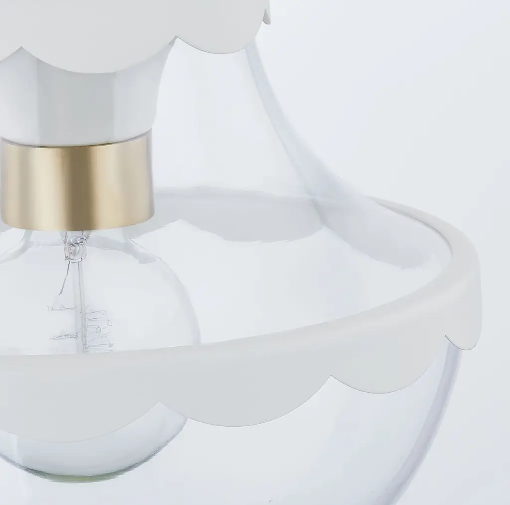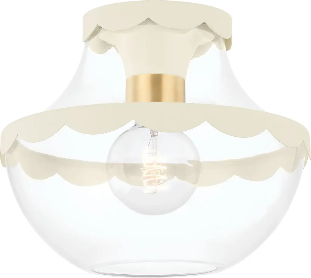 Scalloped metal trim given an ivory finish brings cottage charm to this ceiling fixture, while the brass accents add a glamorous gleam. Because this semi-flush mount is damp rated, you can hang it in a bathroom as well as above a dining table, in a foyer, or just about anywhere else in your home.