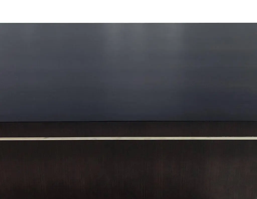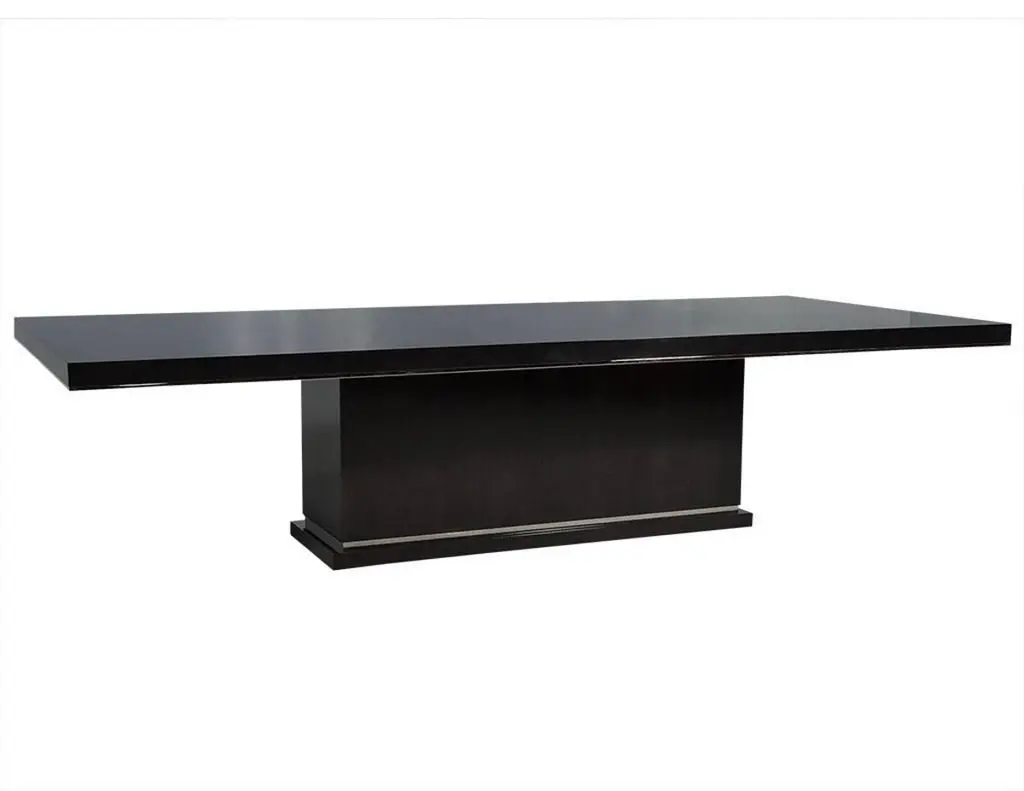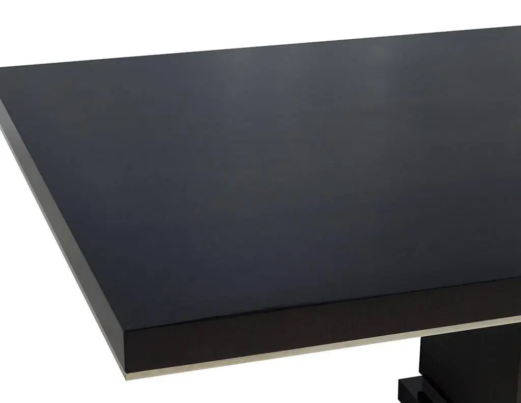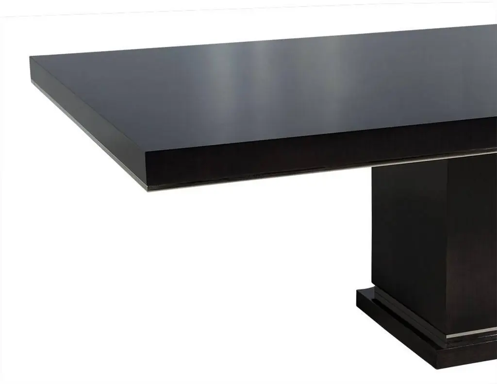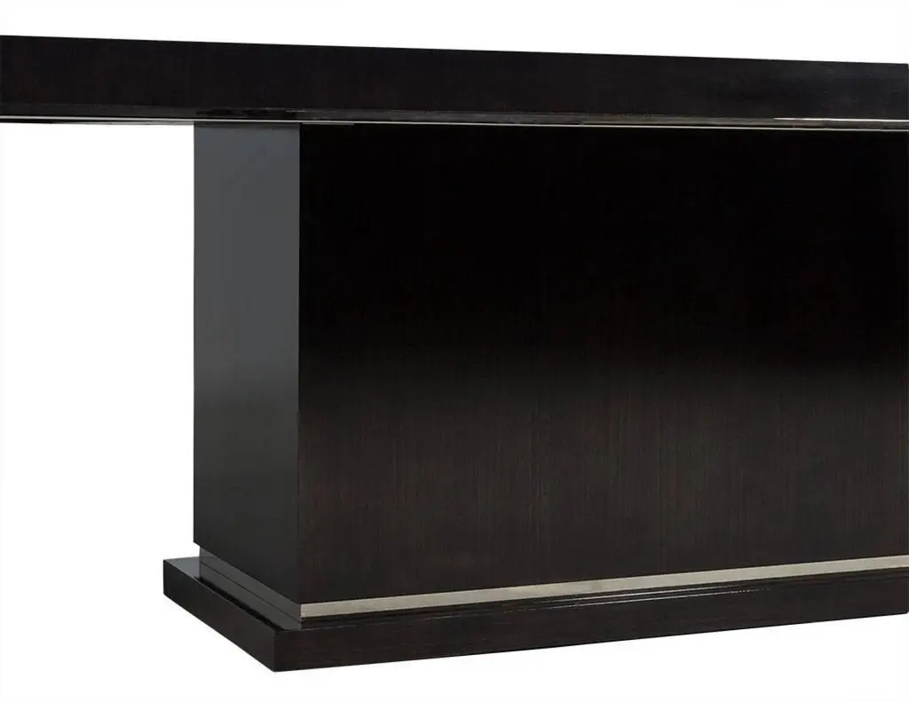 This modern dining table is a Carrocel Custom creation. It is handcrafted out of solid walnut and stained in a deep charcoal black finish, hand polished to a luxurious sheen. The solid base is accented with polished nickel detail, adding just the right amount of adornment for a contemporary dining room.
