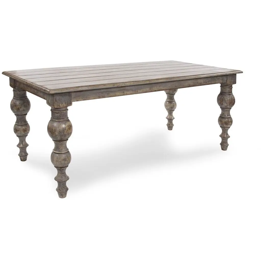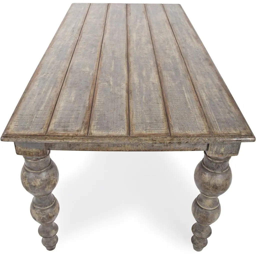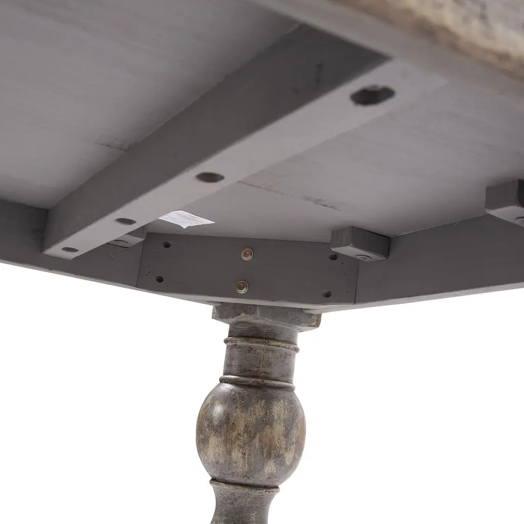 Our antique buying trips throughout the world have opened our eyes to a number of styles and finishes that are still sought after to this day. This dining table with its distressed wood and gray finish on a farm house styled design is creating a keepsake for a new generation.
